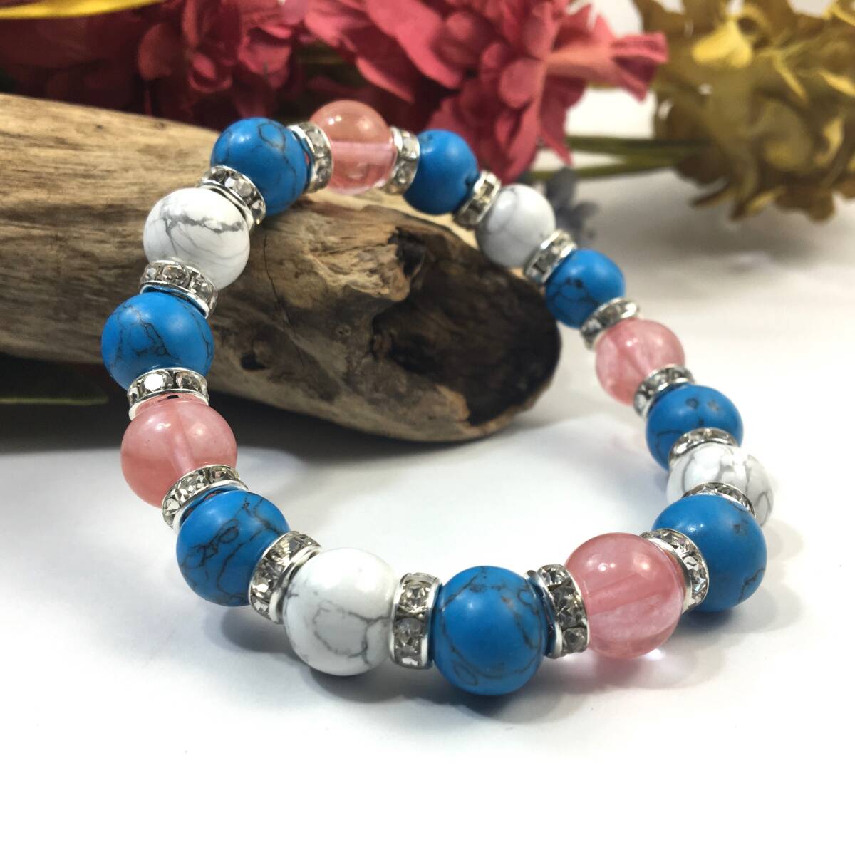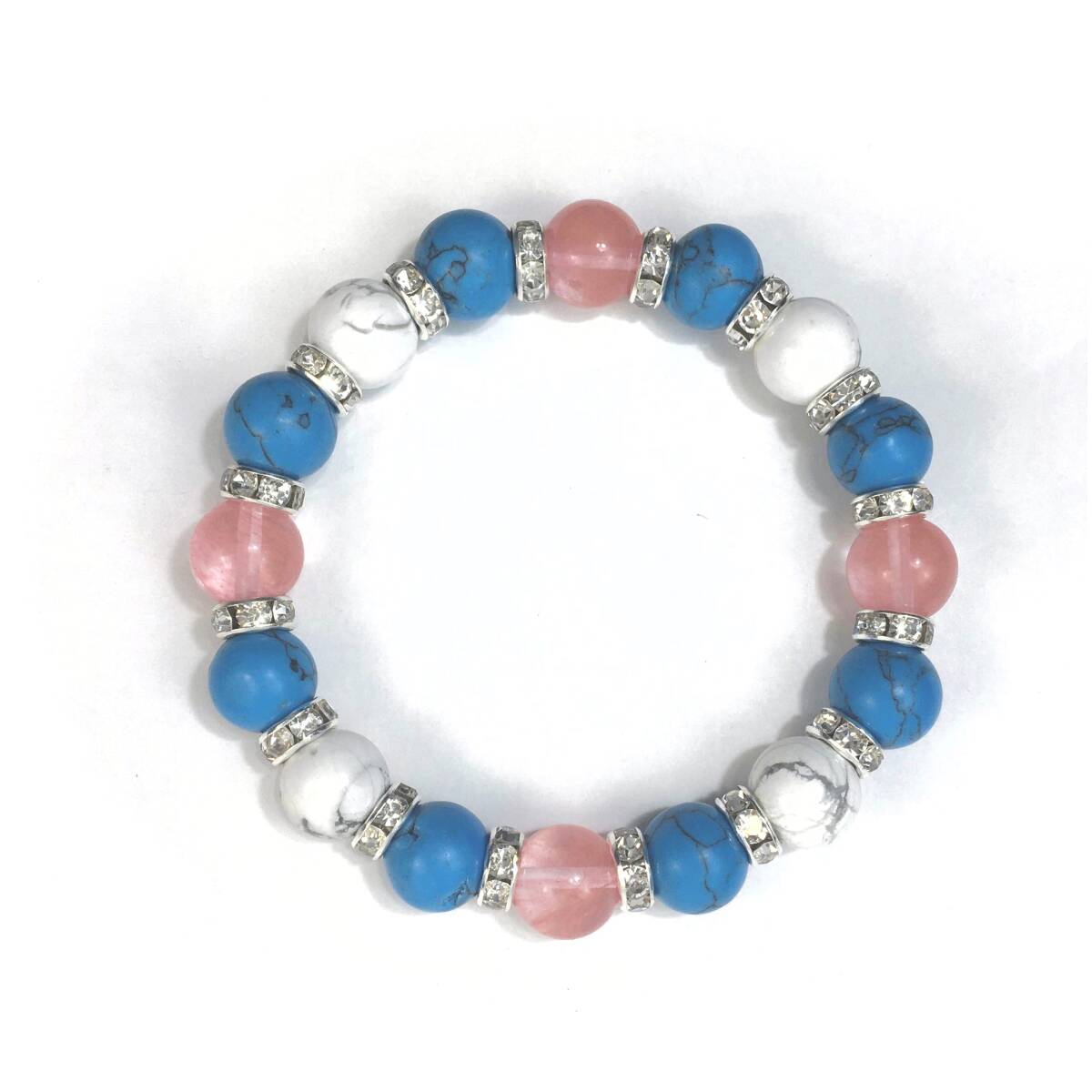 こちらは、チェリークォーツとハウライトとターコイズを組み合わせたブレスレットです。間にはロンデルを挟み高級感あるデザインに仕上がっています。石大きさは腕にも馴染みやすいように10mm玉で内径約17cm(伸可能)です。数に限りがございますので気になる方はお早めにどうぞ。サイズ調節も可能ですのでサイズ調節の場合は取引ナビにてご一報くださいませ。(サイズ調節無料です)
