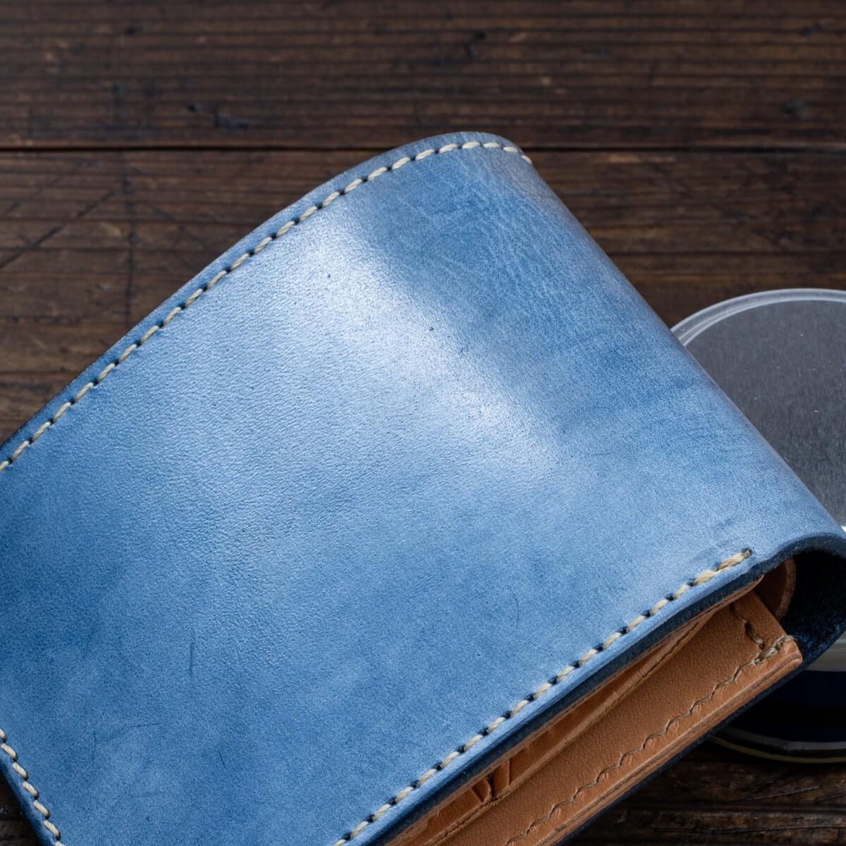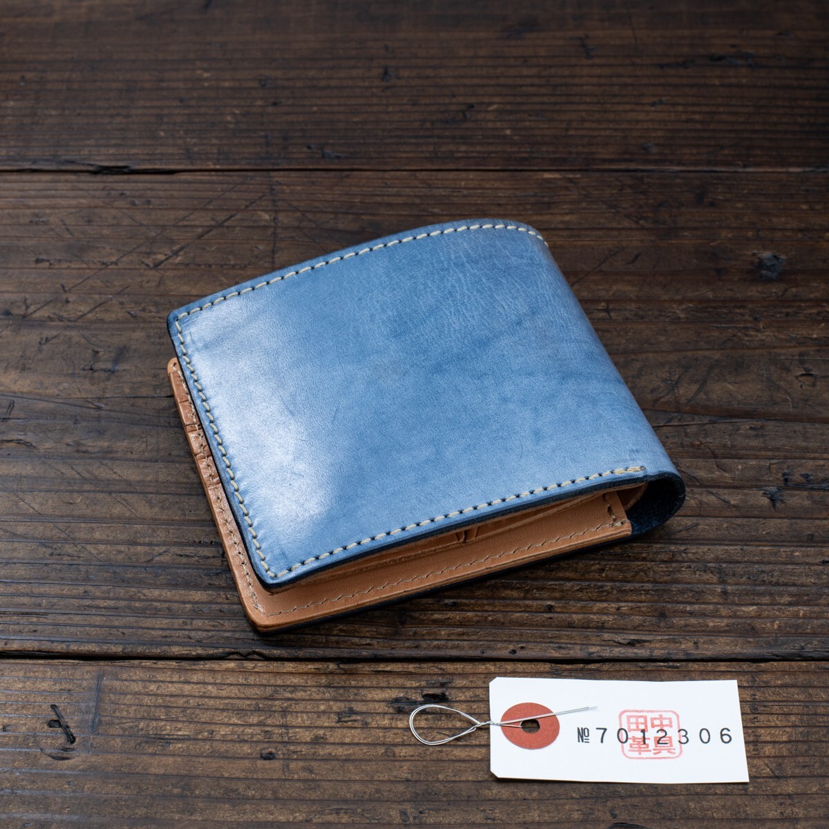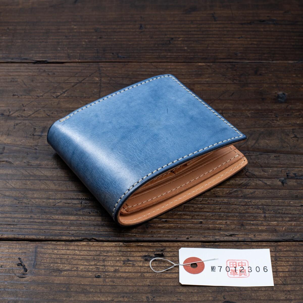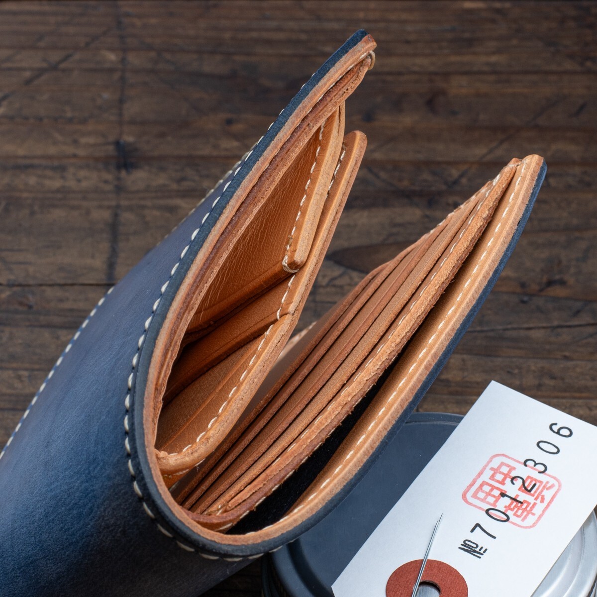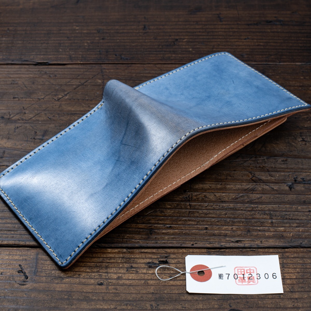 ワックスレザー【牛革】メンズ 二つ折り財布 新品 未使用 送料無料 1円 ヌメ革 本革 ロウ ブライドルレザー ブルー 青 実物撮影 田中革具