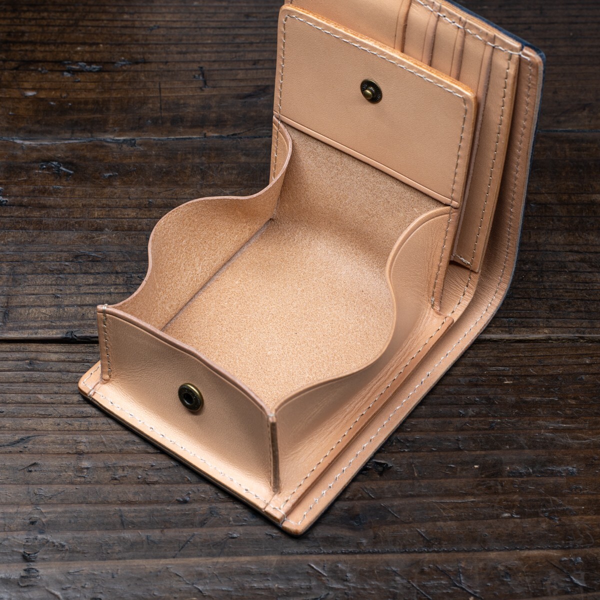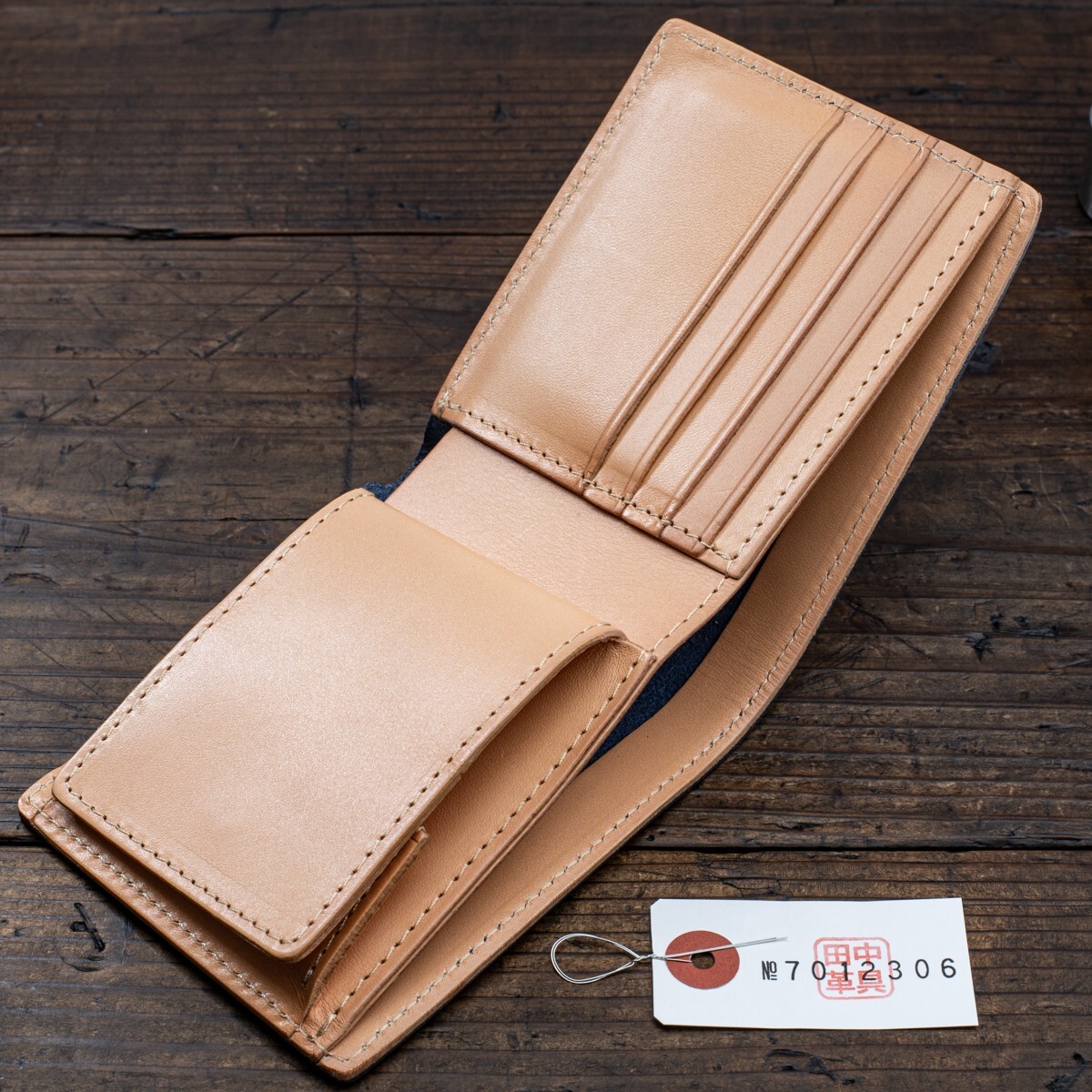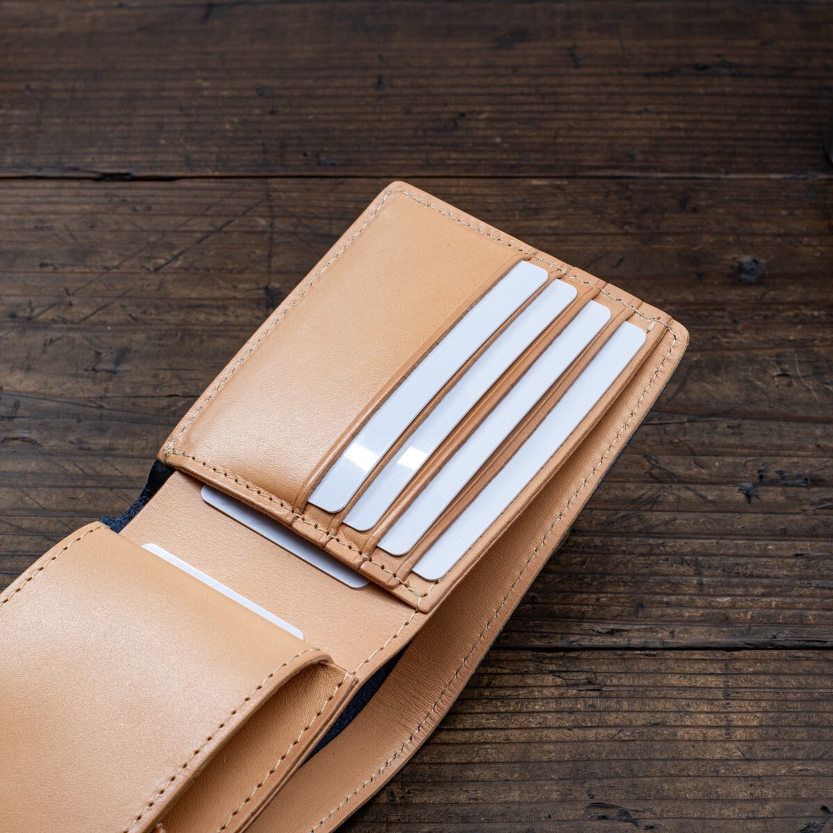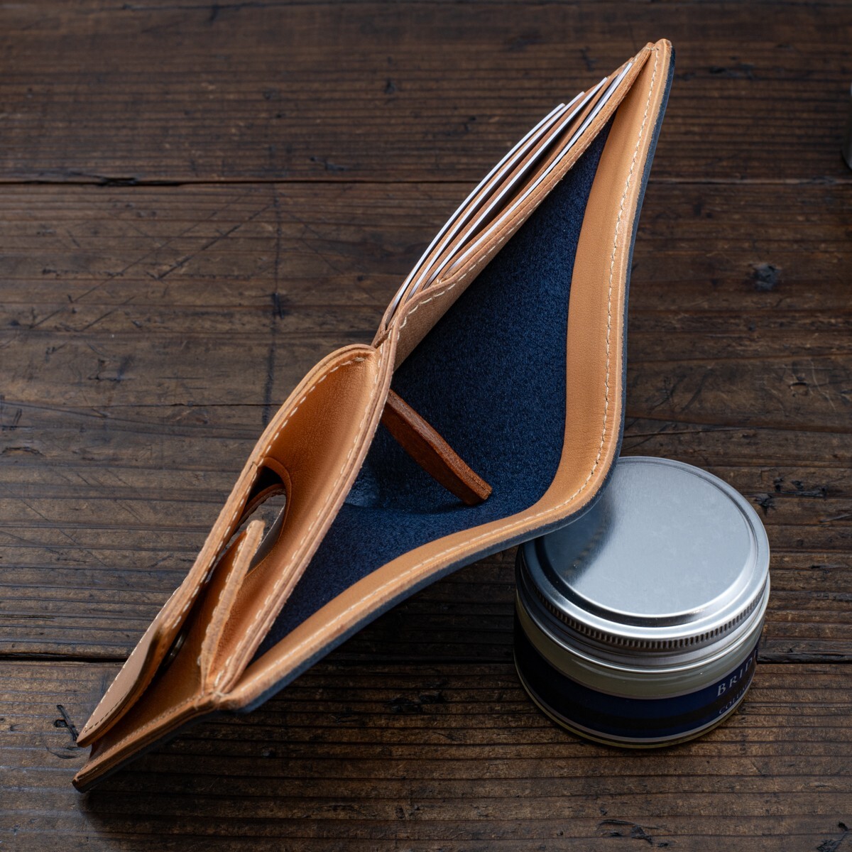 外側にワックスレザー、内側にナチュラルレザーを使った二つ折り財布です。内布を使わずすべて本革で仕立てているため丈夫で、使うほどに革全体が自然に変化していきます。