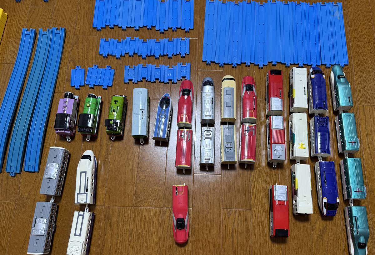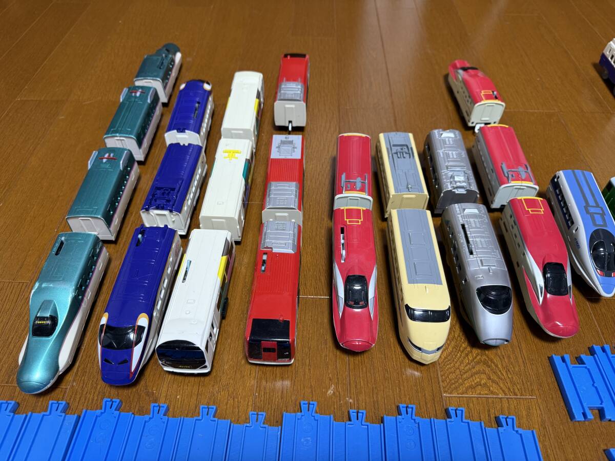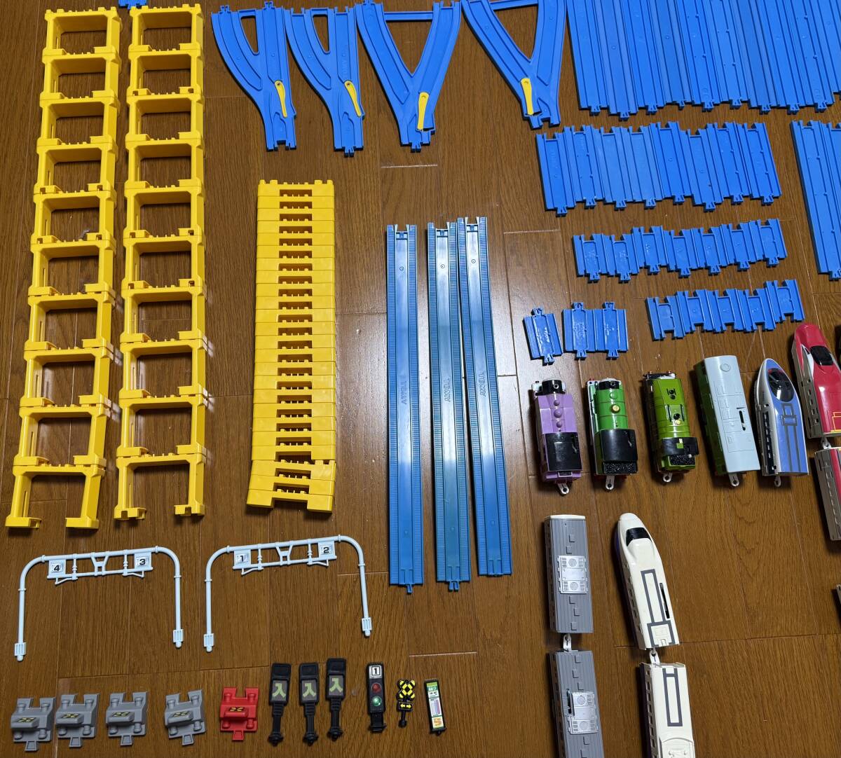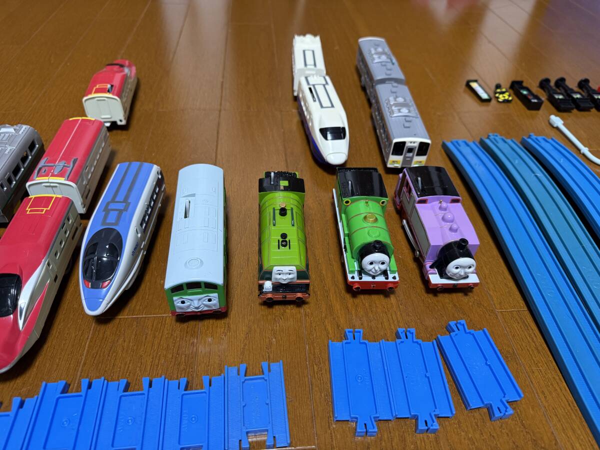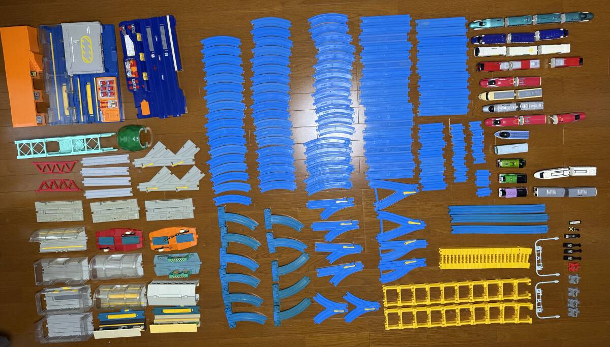 電車は電池も入れっぱなしのもの、入っていないもの、まともに動かないものが混同しており、一部の車両は連結部が破損しております。