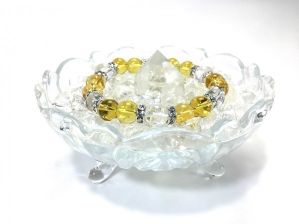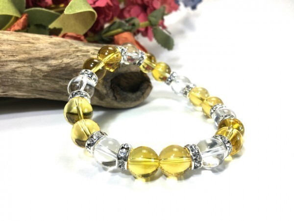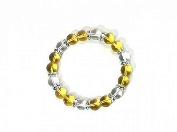 こちらは、シトリンと水晶を組み合わせたブレスレットです。間にはロンデルを挟み高級感あるデザインに仕上がっています。石大きさは腕にも馴染みやすいように10mm玉で内径約18cm(伸可能)です。数に限りがございますので気になる方はお早めにどうぞ。サイズ調節も可能ですのでサイズ調節の場合は取引ナビにてご一報くださいませ。(サイズ調節無料です)
