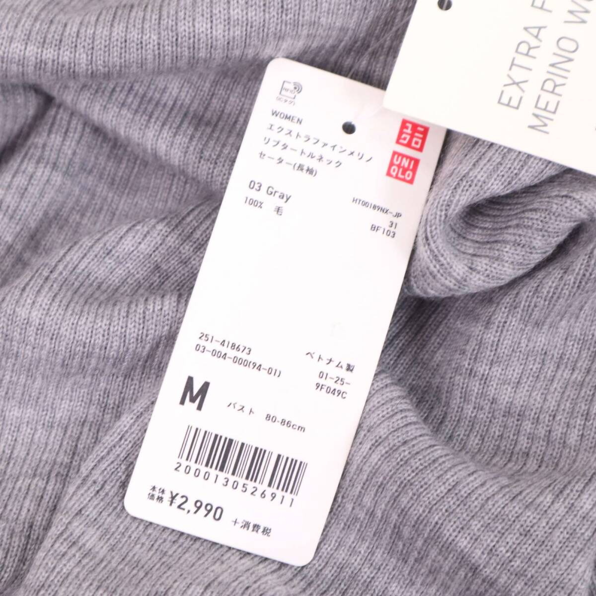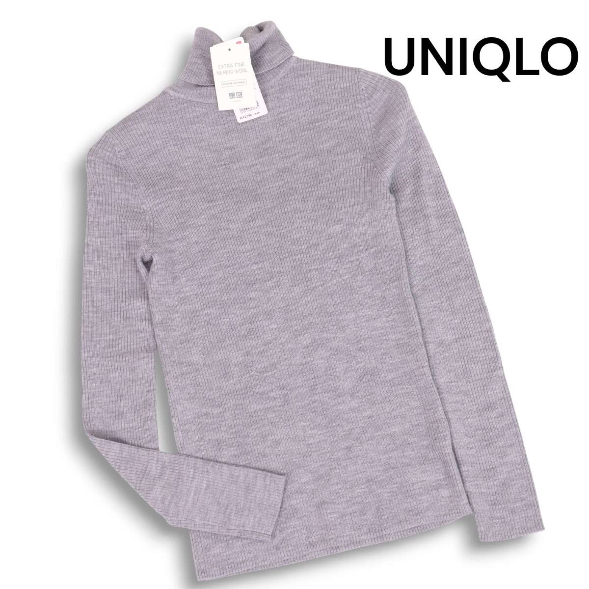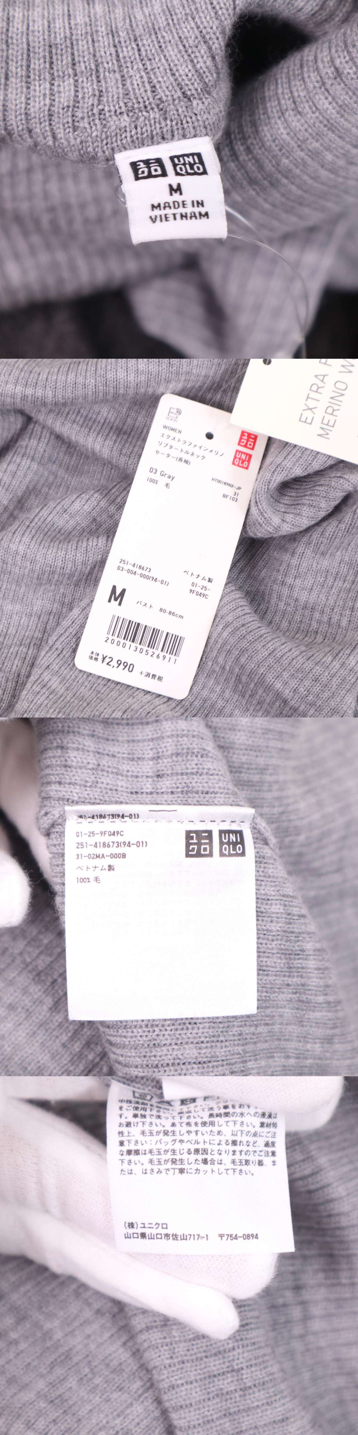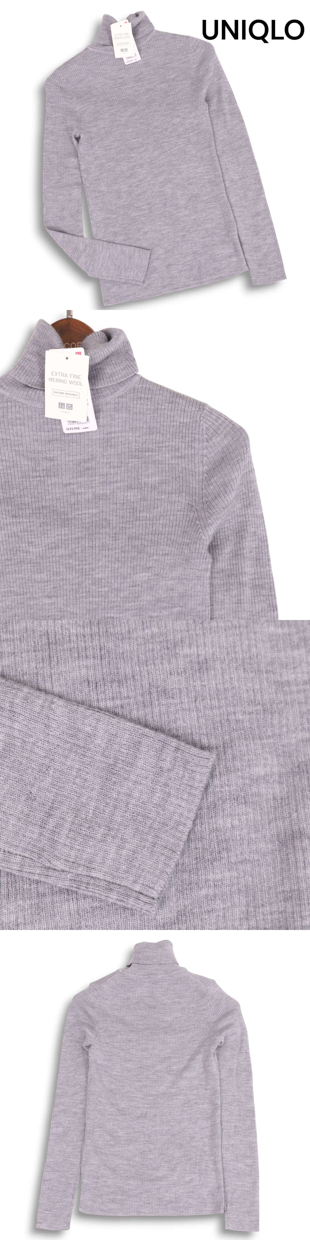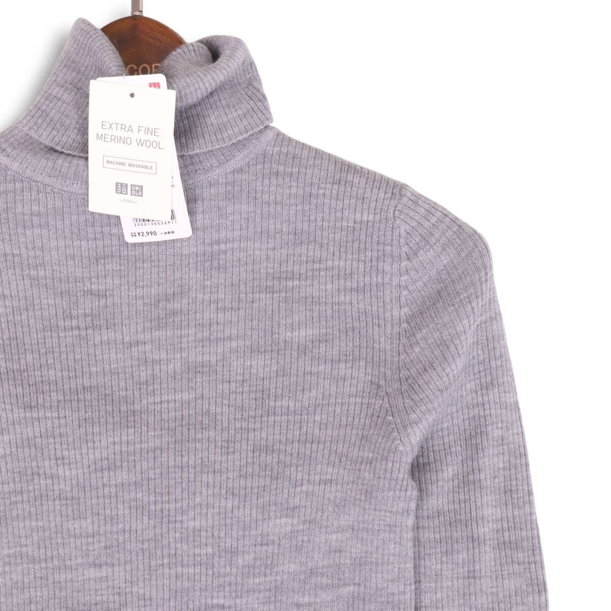新品★ UNIQLO ユニクロ エクストラファインメリノ ウール100% リブ タートルネック ニット セーター Sz.M レディース 灰
