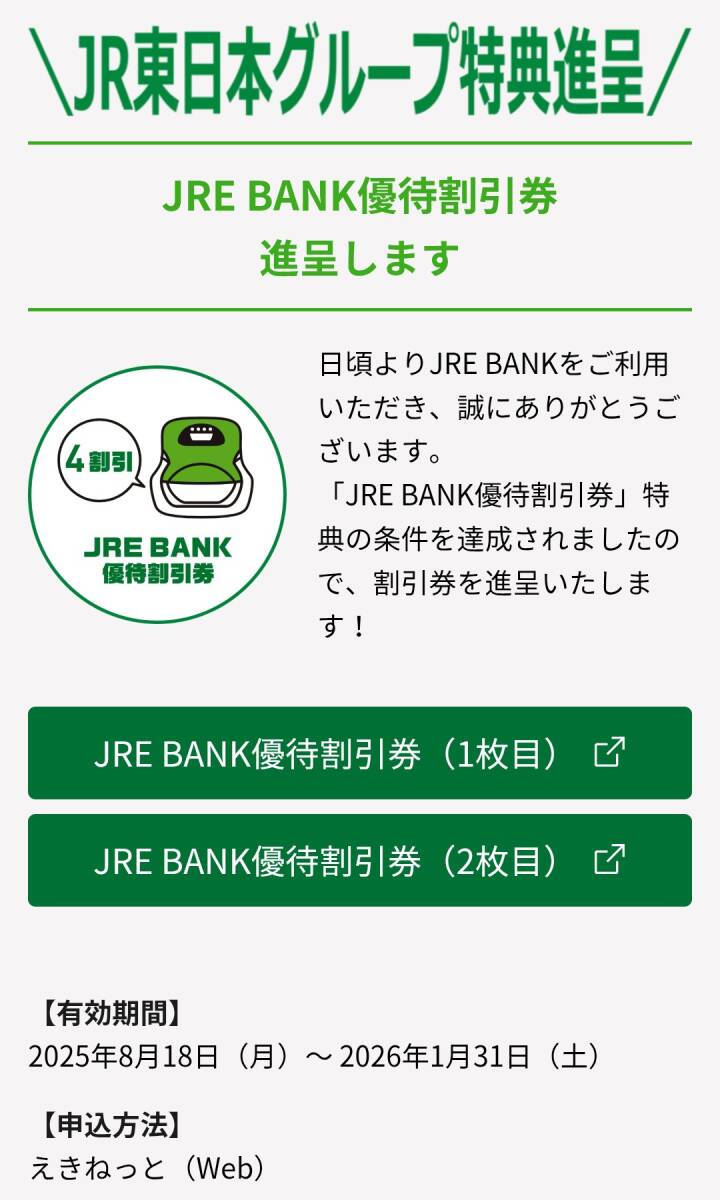 JRE BANK 優待割引券(4割引)2枚 有効期限2026年1月31日