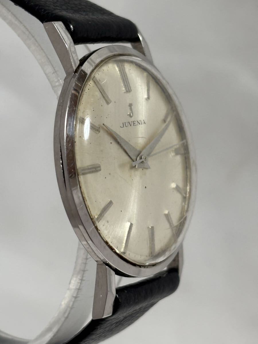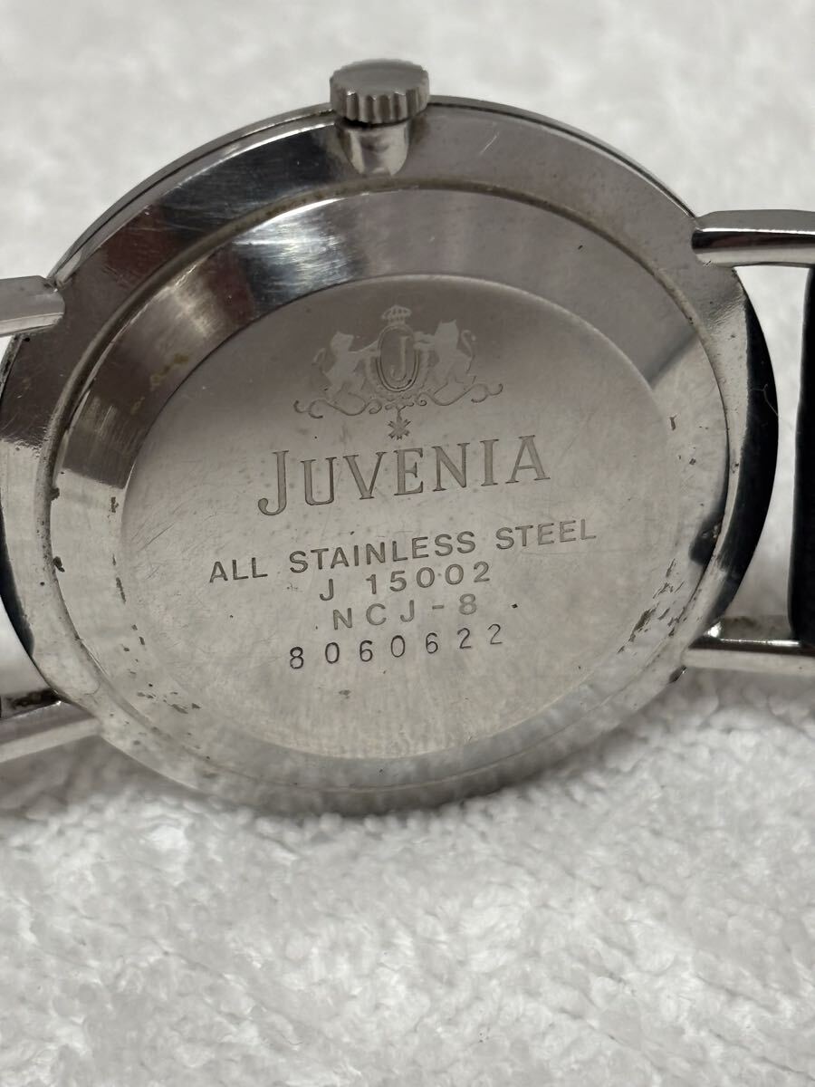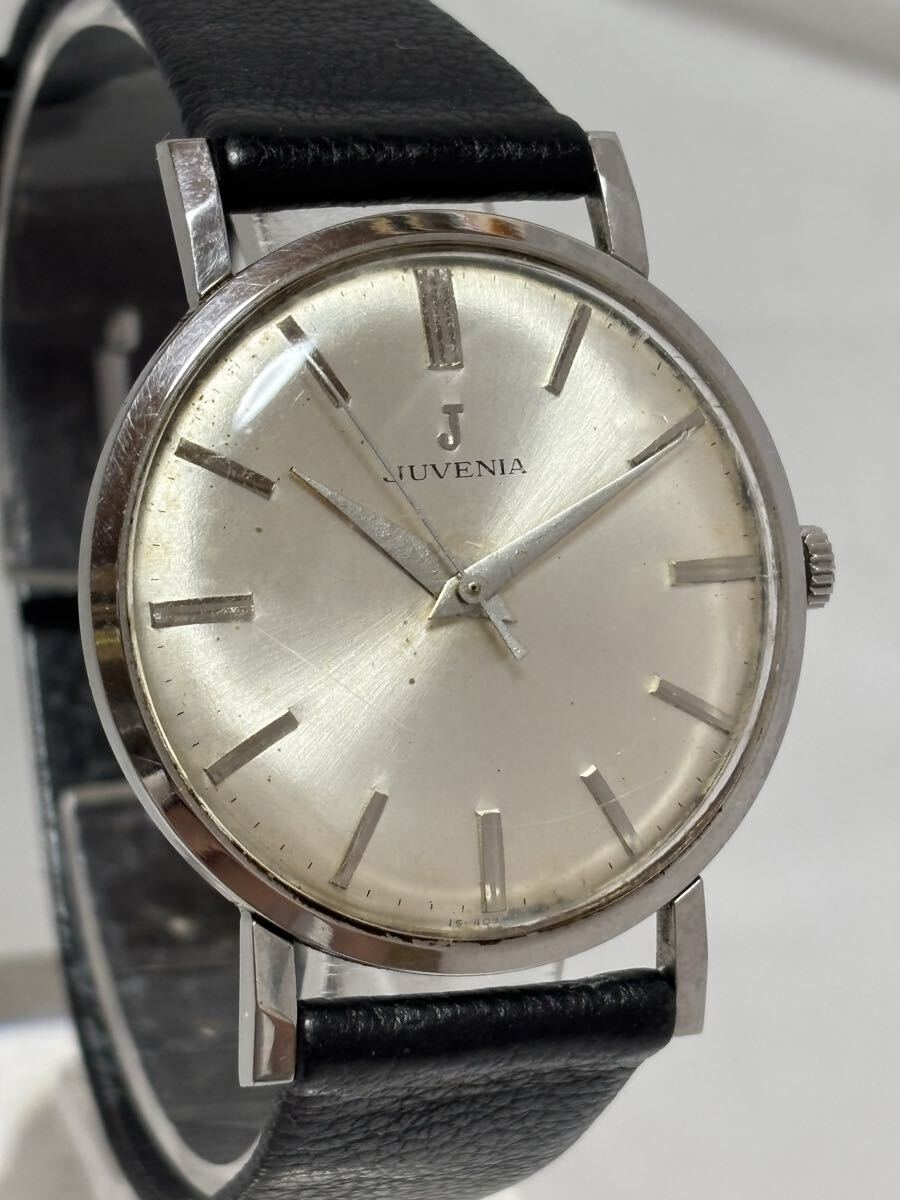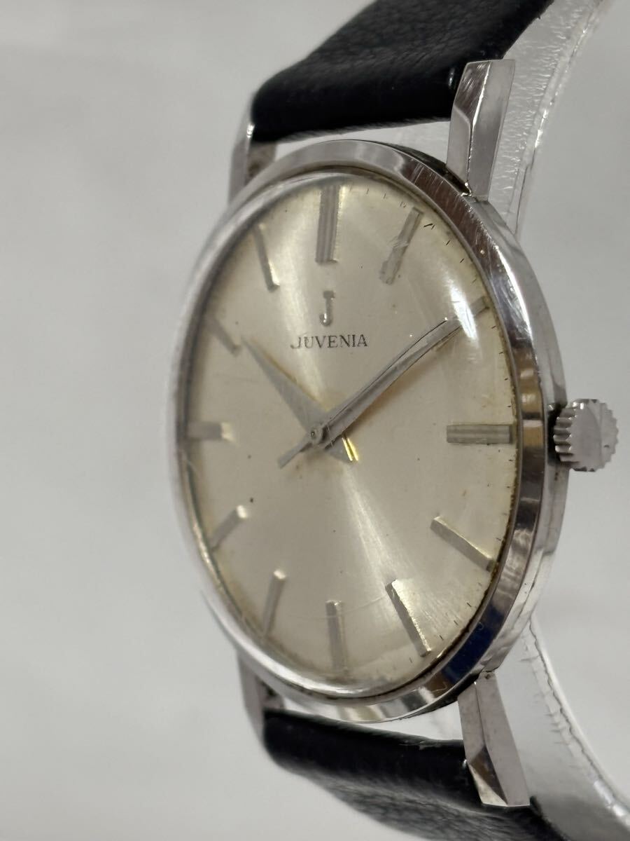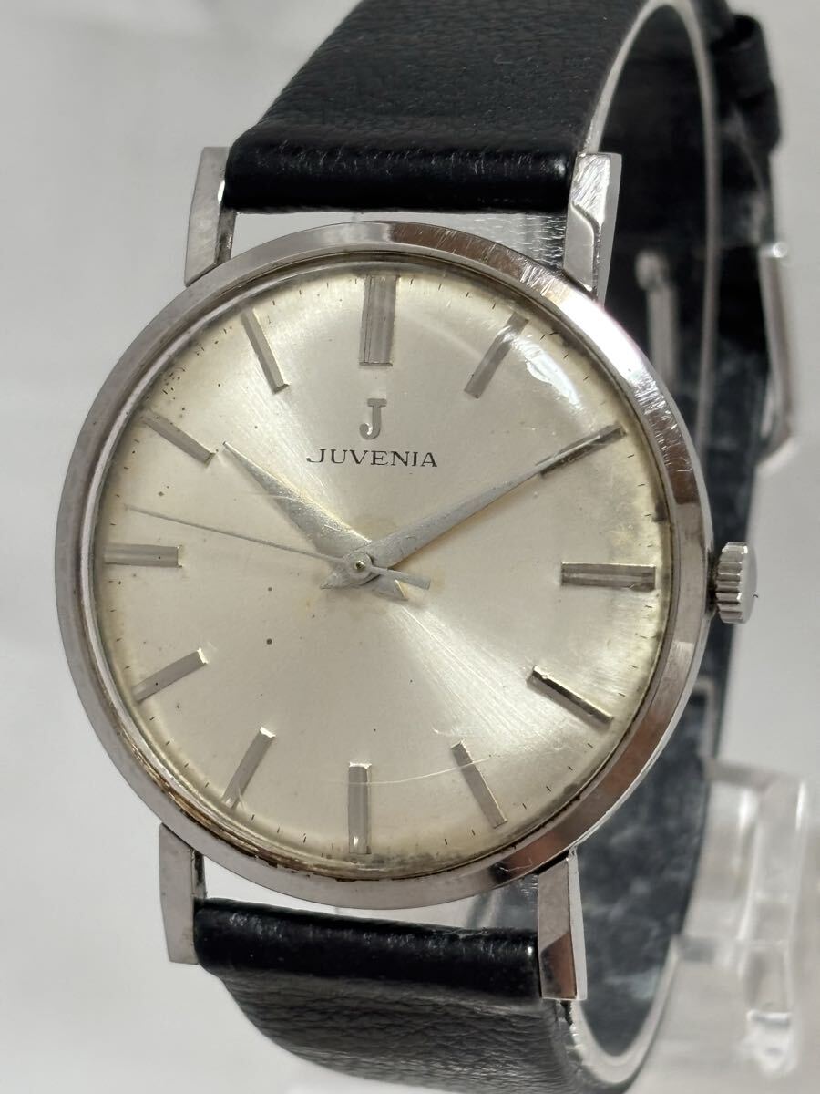 こちらJUVENIA ジュベニア J15002 手巻き シルバー メンズの出品をさせていただきます。文字盤汚れあり、風防やケース面に小傷やスレなどございます。ベルト面にも劣化があります。動作に関しては稼働品。竜頭使用における針の操作など問題ございません。その後のメンテナンスにつきましては落札者様の方でお願い致します。その他未確認ですが、ご検討宜しくお願い致します。