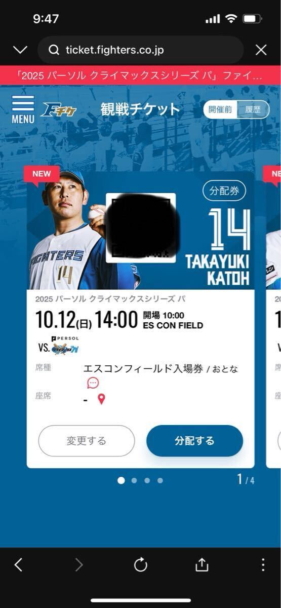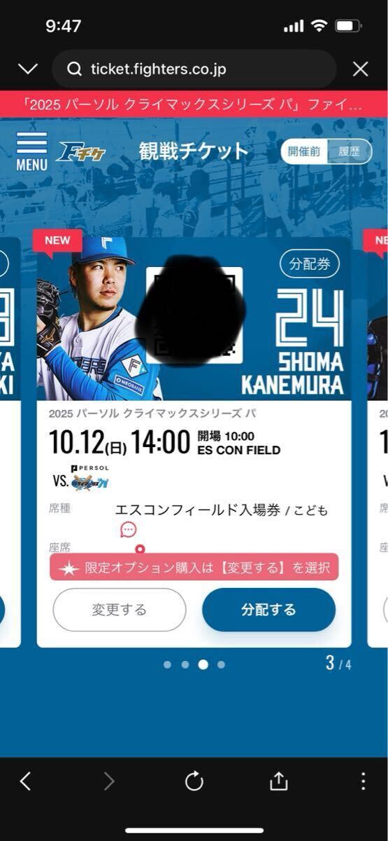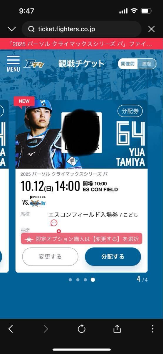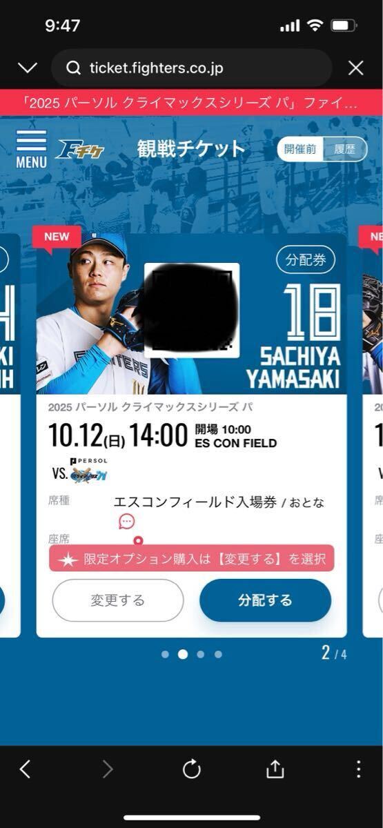 ★10/12★クライマックスシリーズ第2戦☆日本ハムVSオリックス☆入場券☆エスコン★大人2枚、小人2枚★