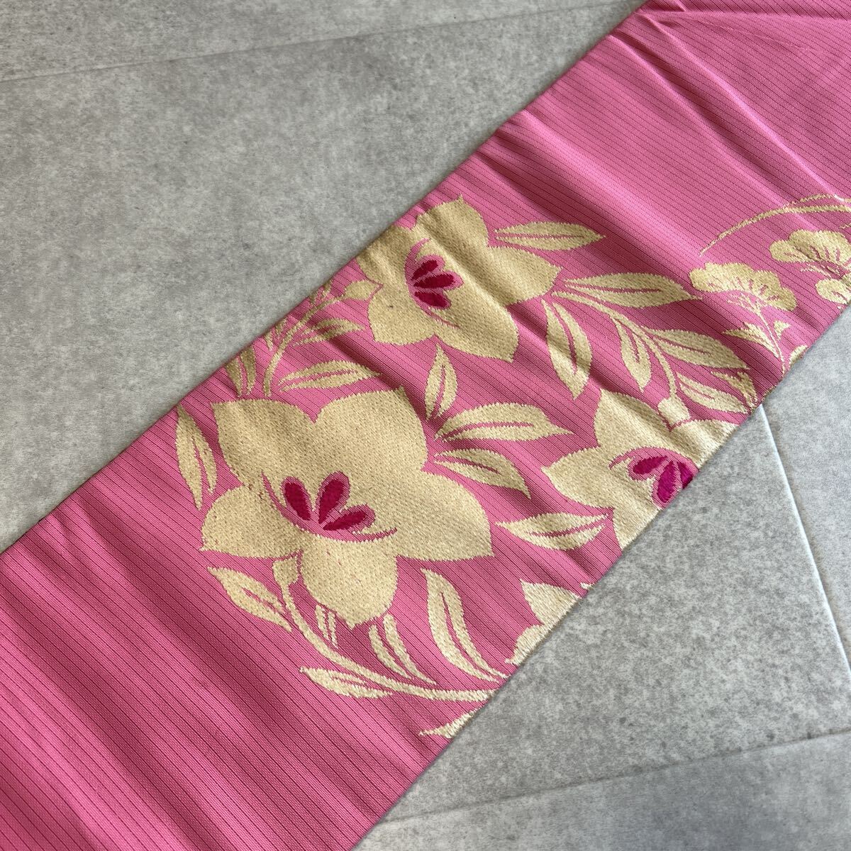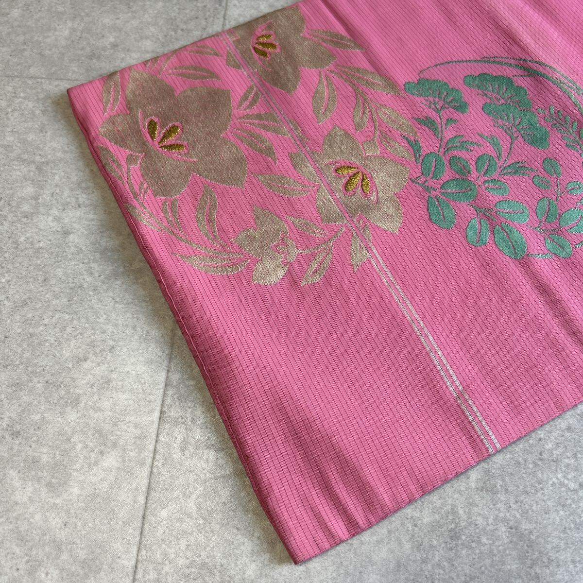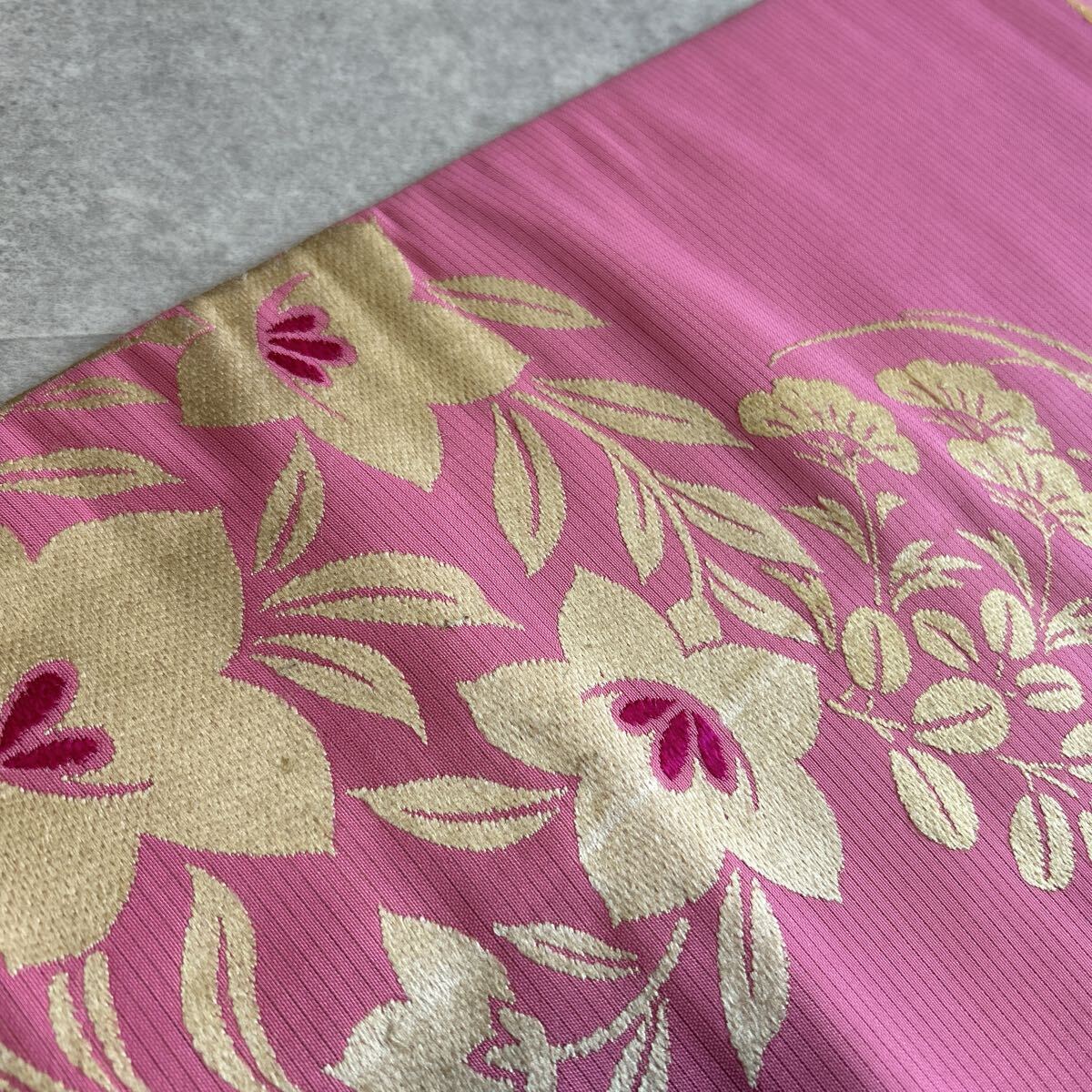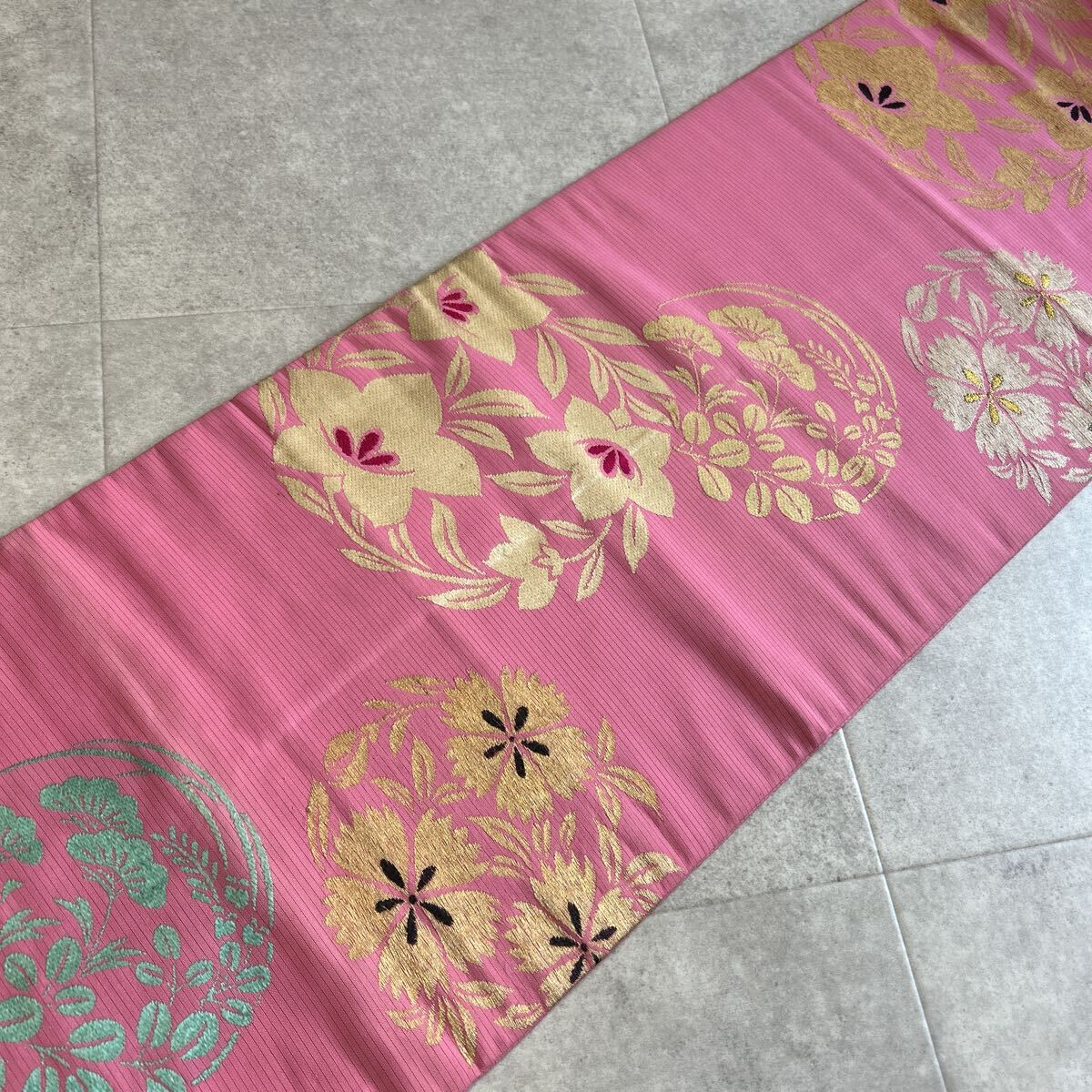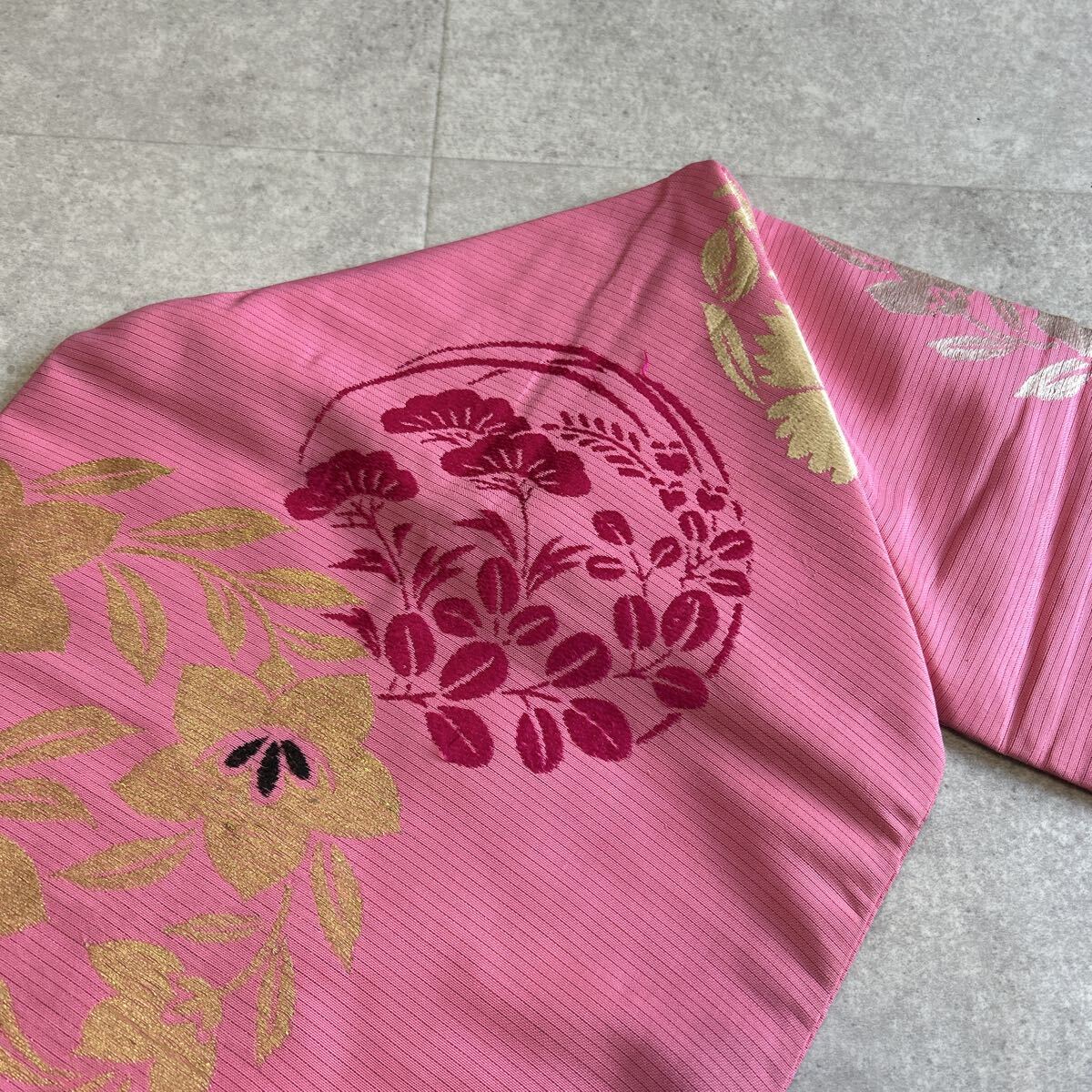 アンティーク 名古屋帯 ピンク 花 唐織 金糸 着物 昭和レトロ 大正ロマン モダン 和洋折衷コーデ リメイク 25こ01-14t