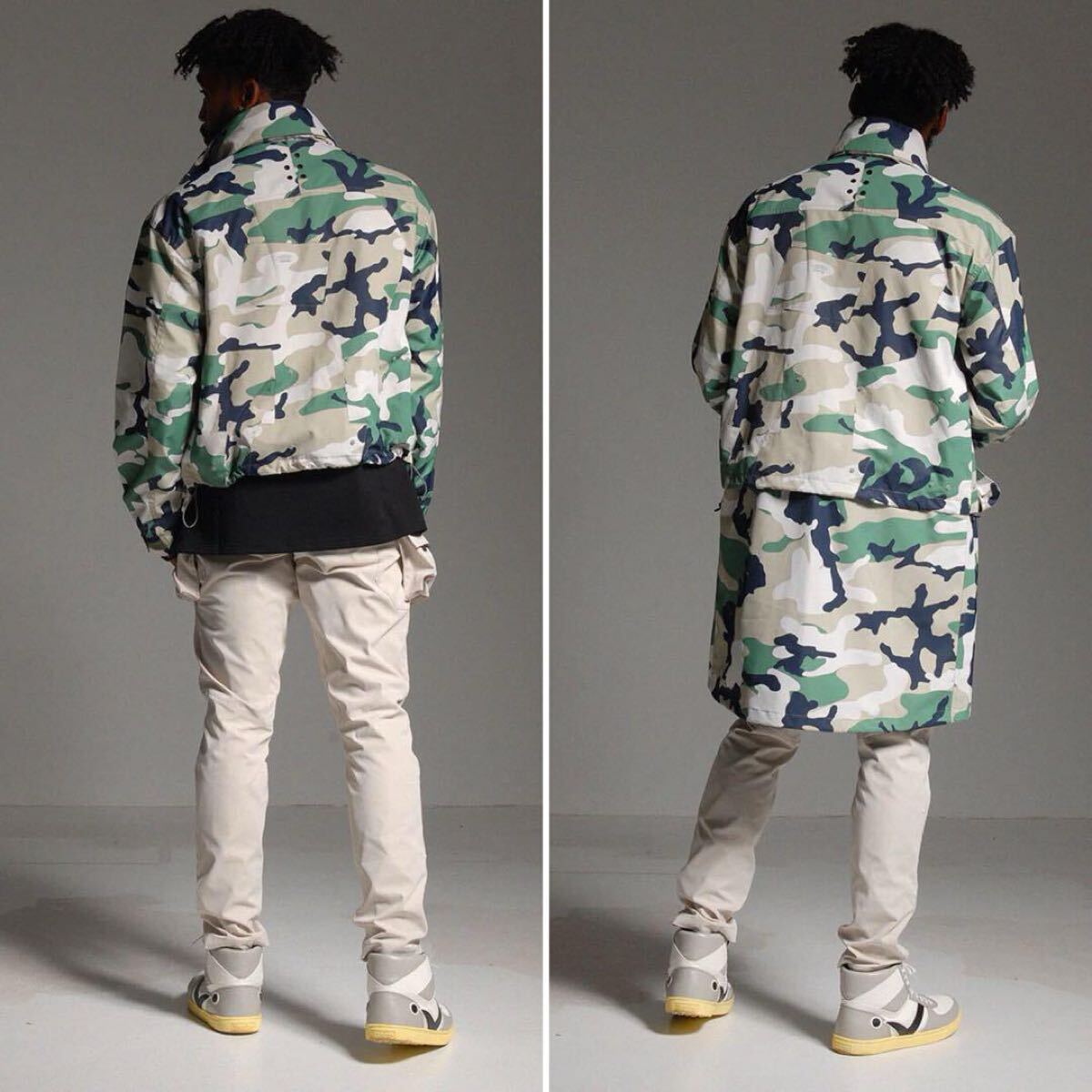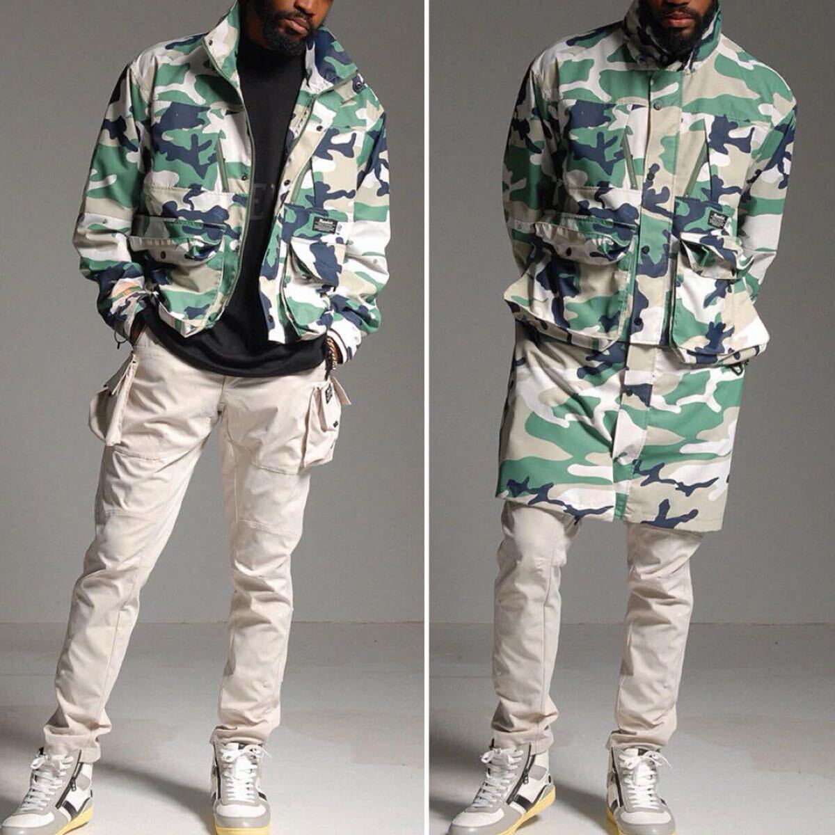 通常時はロング丈デザインのジャケットですが、ウェスト下よりファスナーでコートパーツを取り外すことでショート丈ジャケットとしても着用が可能です。