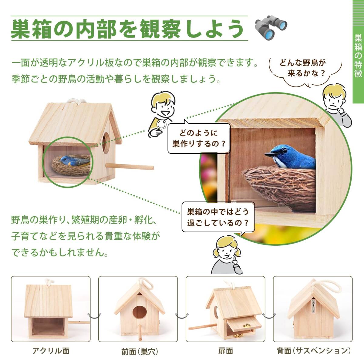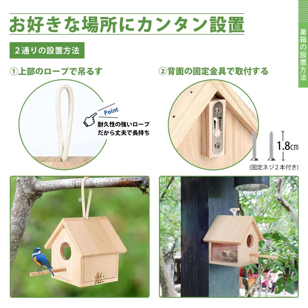 天然木材を使用し環境にやさしく、耐久性に優れています。 片面がアクリル素材のため開けなくても中の様子を確認することができるタイプの巣箱となっています。 庭先や公園など様々な場所に簡単に取り付けることができます。