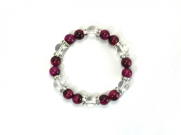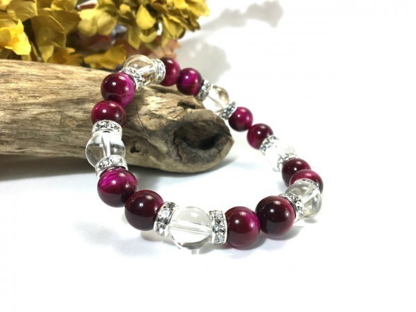 こちらは、ピンクタイガーアイと水晶を組み合わせたブレスレットです。間にはロンデルを挟み高級感あるデザインに仕上がっています。石大きさは腕にも馴染みやすいように10mm玉で内径約18cm(伸可能)です。数に限りがございますので気になる方はお早めにどうぞ。サイズ調節も可能ですのでサイズ調節の場合は取引ナビにてご一報くださいませ。(サイズ調節無料です)