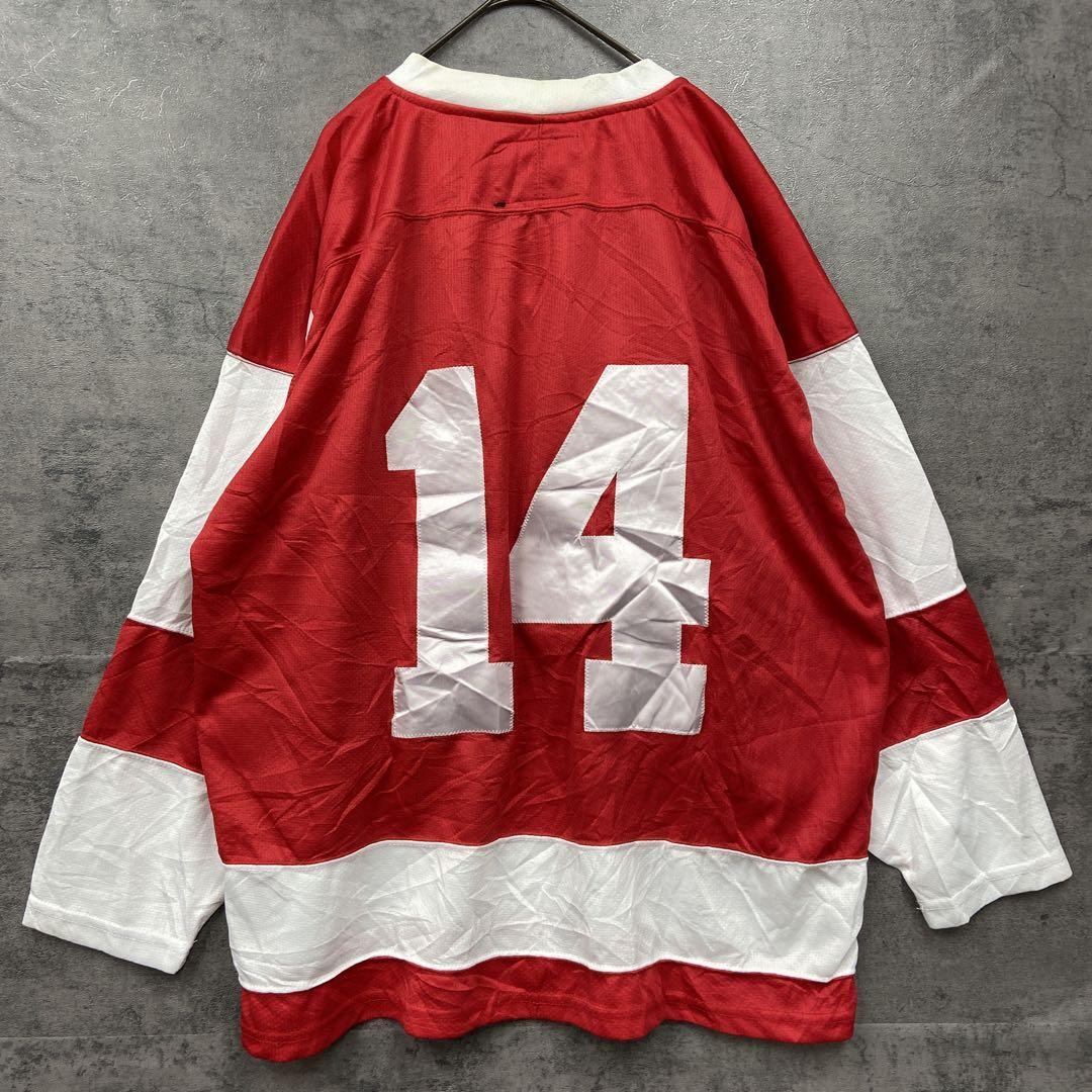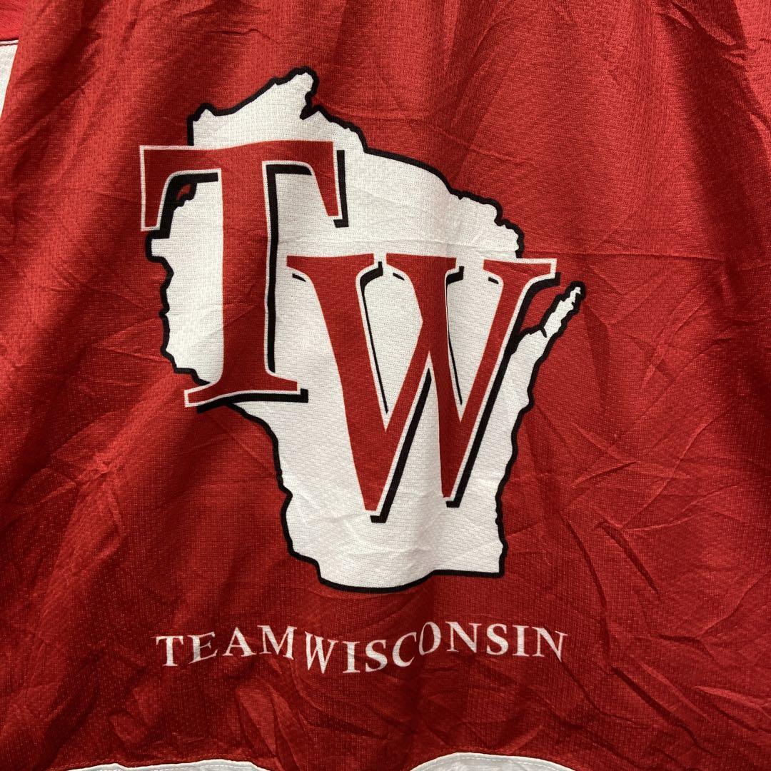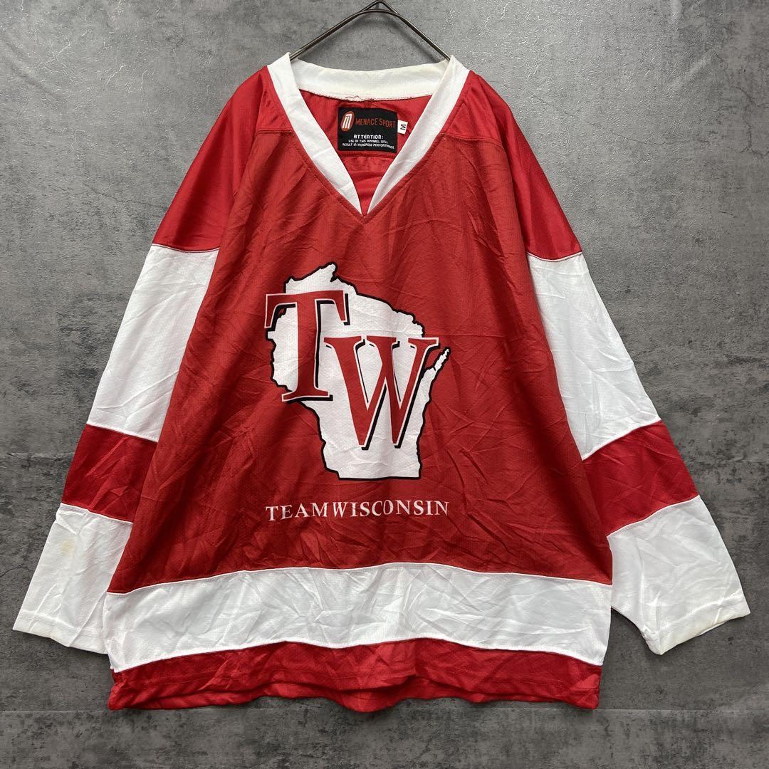 レッド×ホワイトの配色に「TW TEAM WISCONSIN」ロゴと背番号14が入ったメナススポーツのホッケージャージで、古着ならではの存在感が楽しめるスポーツユニフォームです。