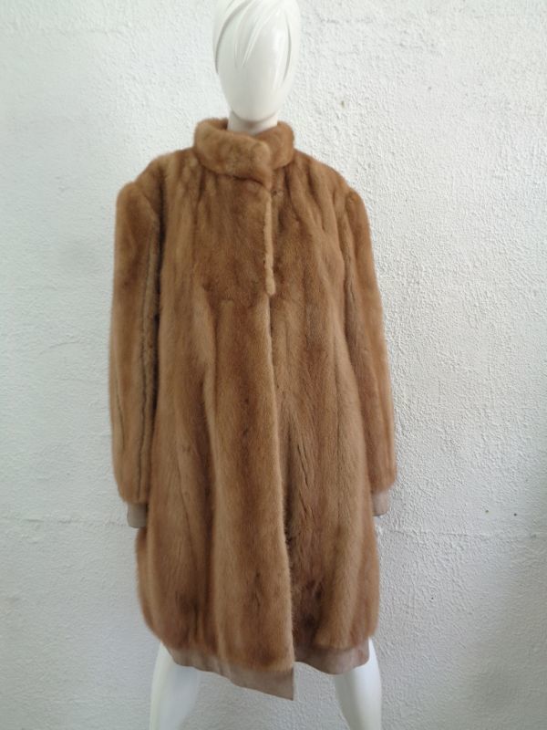 美しいパステル・ミンク毛皮ファー・コート。ライトブラウンの滑らかな毛並み。ベージュ・スエードのカフスと裾まわり。マオカラー。フック&アイの留め具。