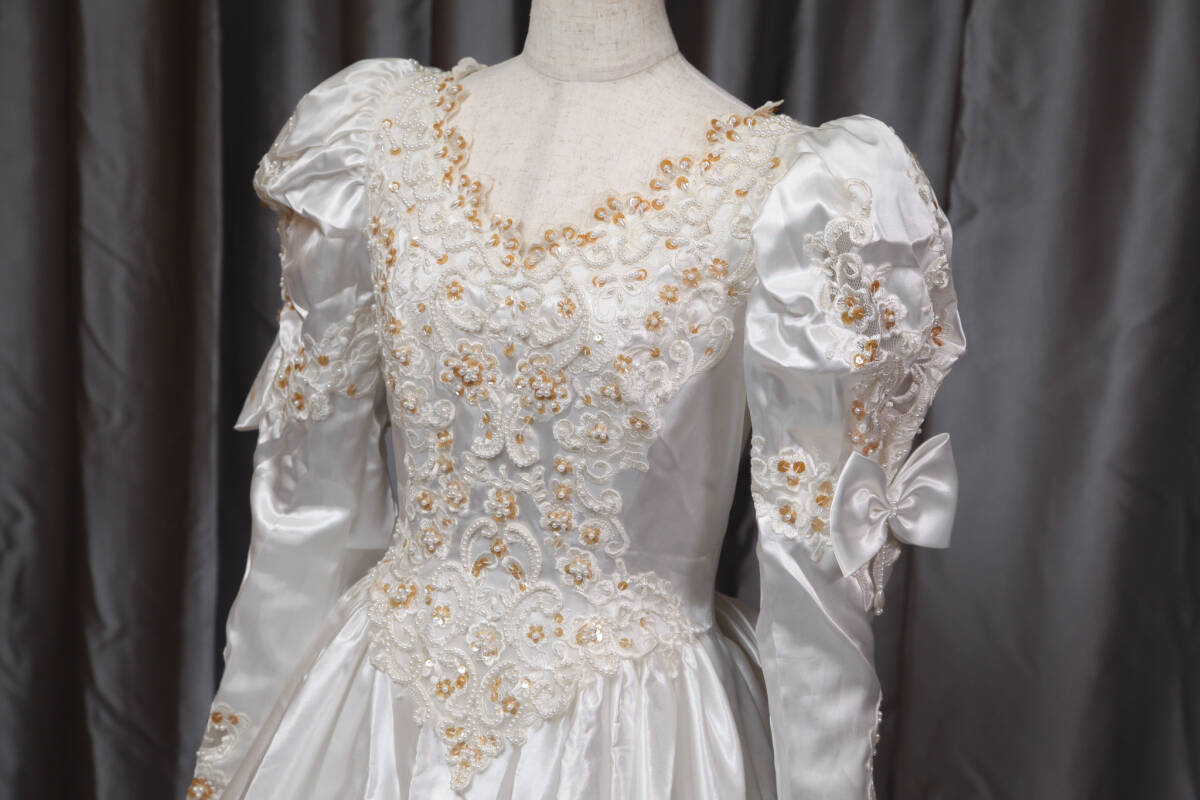 商品には 「シミ」「刺繍のほつれ」「引きつれ」「ビーズ・スパンコールの劣化・変色・脱落」「たたみ皺」「素材臭(パニエチュール等に使われているポリエステル臭)」 があります。
