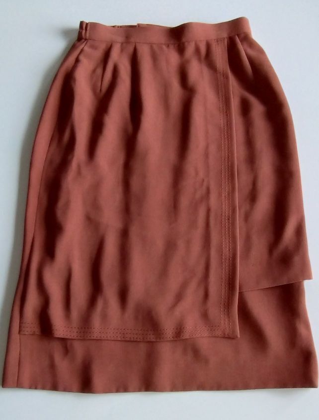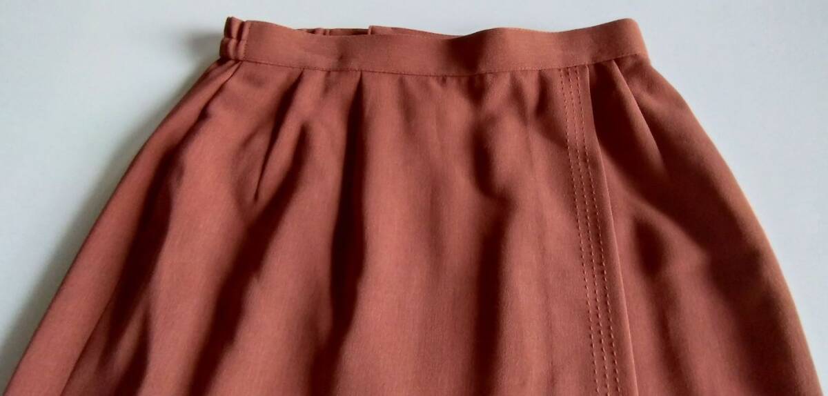 重ね布風なデザインが素敵なスカートです。 保管時のシワが少し見られますが、 目立つ汚れは見当たりません。 カラー;レンガ色 素材;表地-ポリエステル100% 裏地-レーヨン100% サイズ;9号 ウエスト約65cm前後・スカート丈67cm |