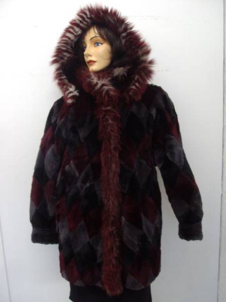 ユニークなマルチカラー・シェアード・ビーバー毛皮ジャケット。グレー/ブラック/ワインレッドの色合い。フードまわりにホワイト&レッドのフォックス・トリミング。フードは取り外し可能。マオカラー。フック&アイの留め具。ブレスレットカフス。