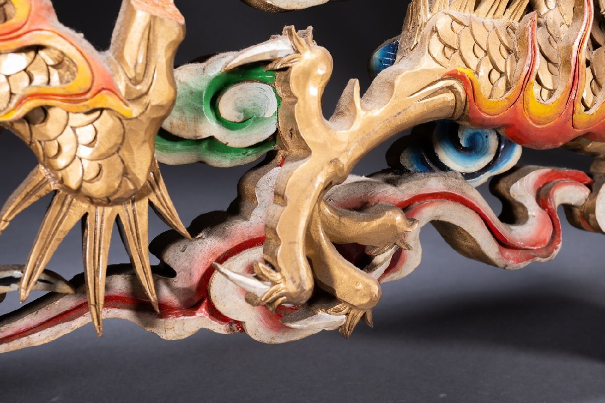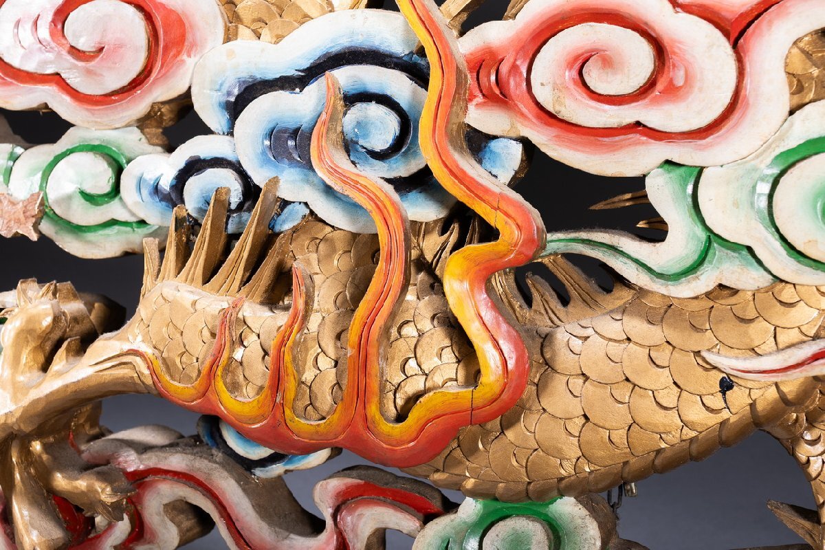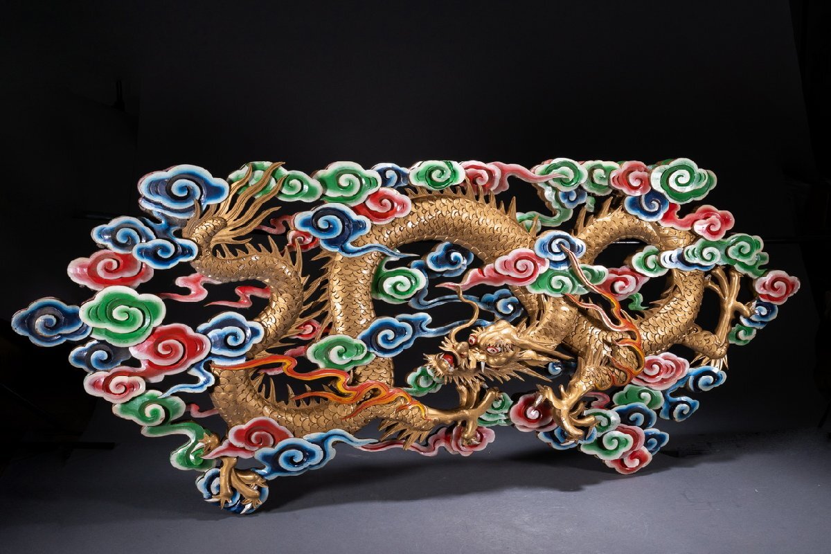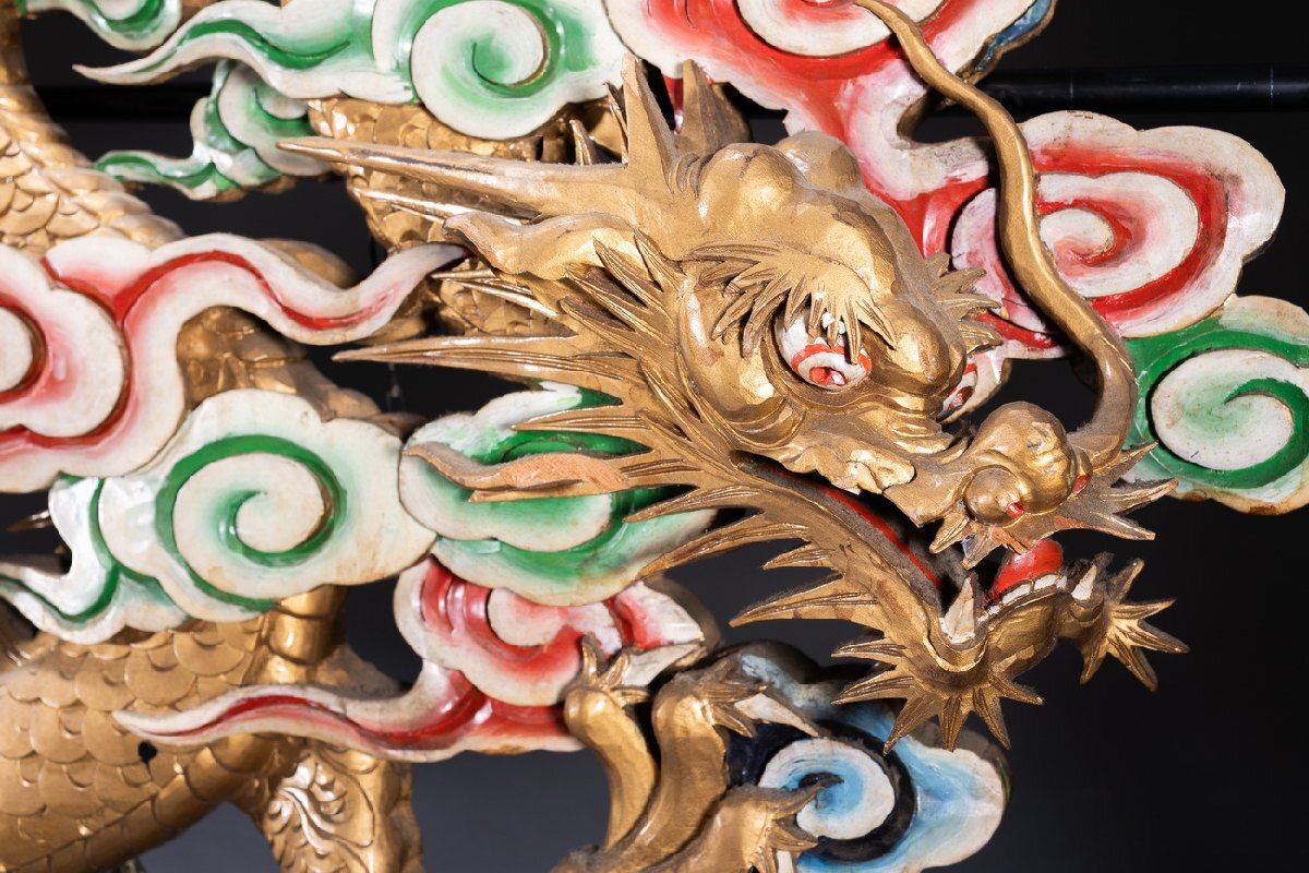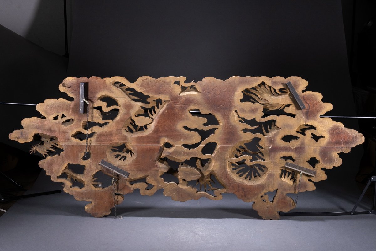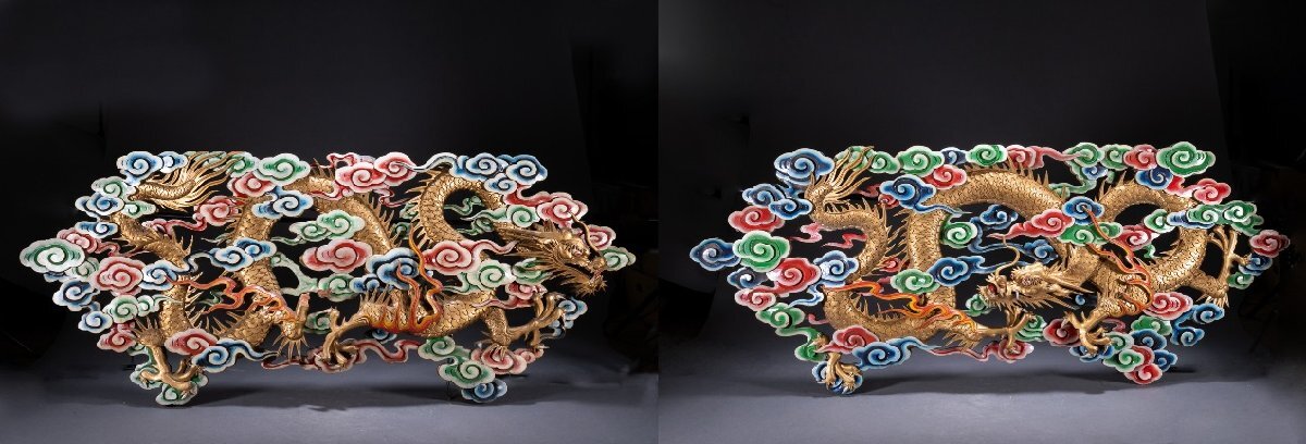 【清】某有名オークション購入 寺出欄間 木彫色絵金彩 巨大雲龍紋欄間(幅173㎝)和彫り 傷あり 激レア 仏教美術品 着払で発送 7L6-890S10