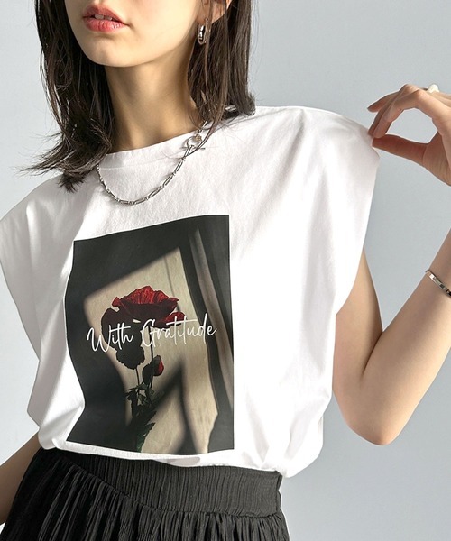 参考商品名:シンプルなのにおしゃれ!シルケットお花フォトフレンチスリーブカットソー