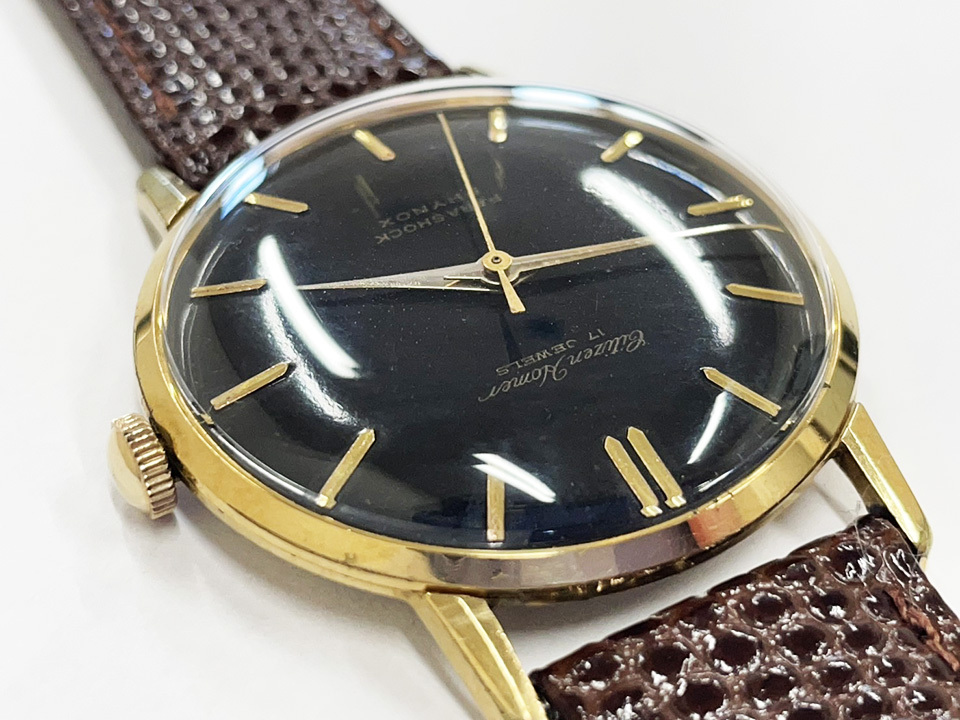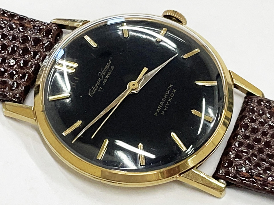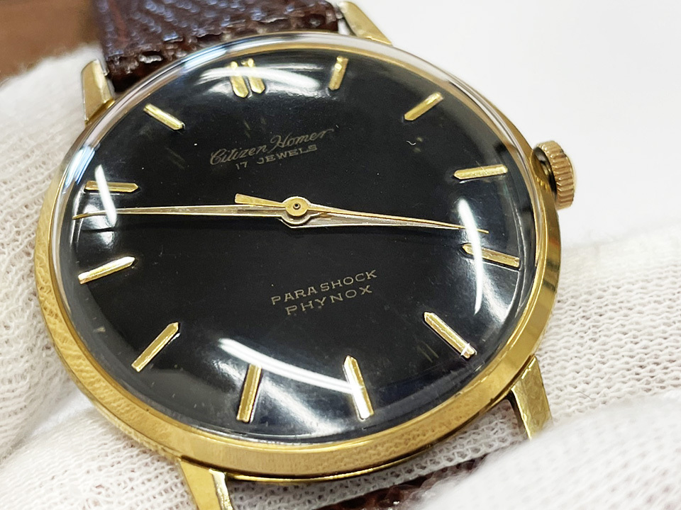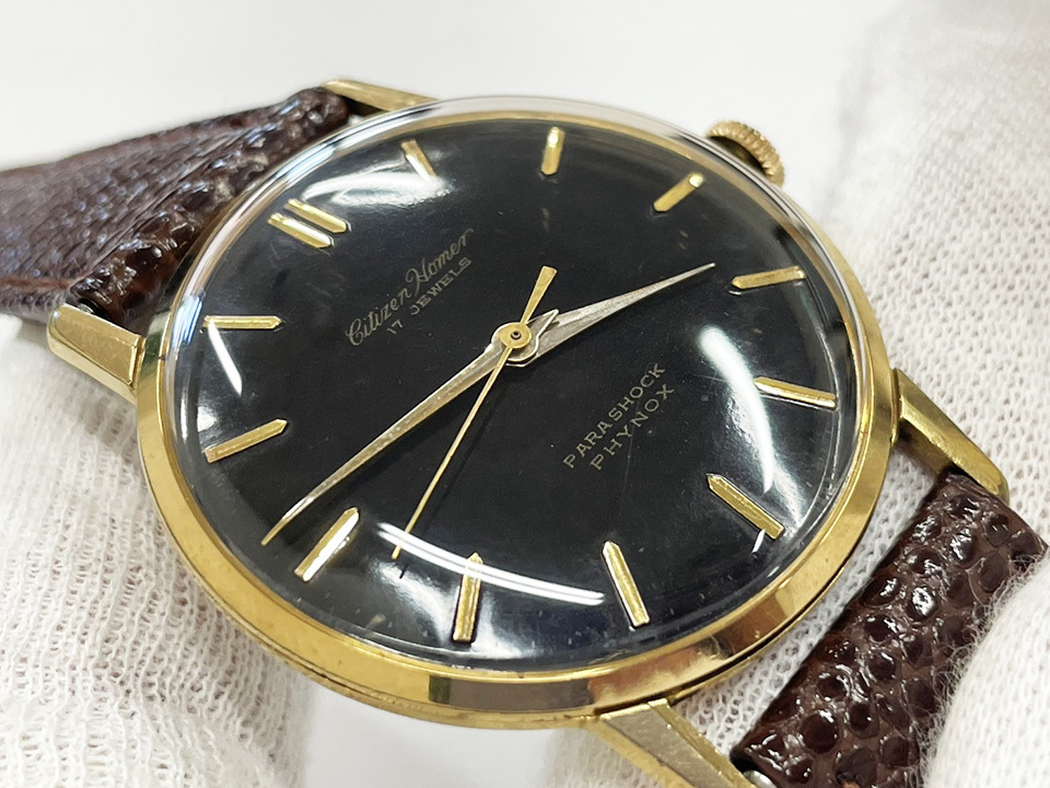 『CITIZEN シチズン ホーマー 17石 F15701 金メッキ ブラックダイヤル 黒文字盤 手巻き 稼働 60年代 ヴィンテージ メンズ 腕時計』です。