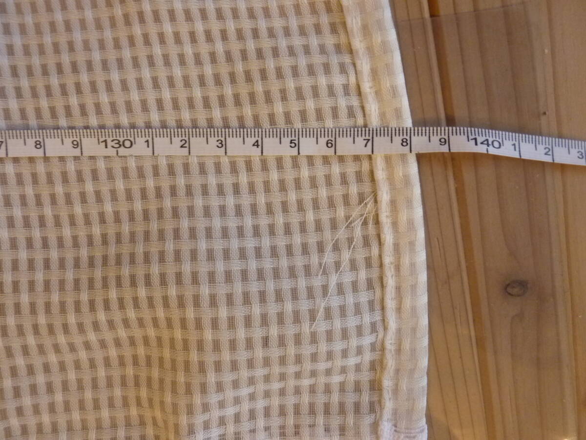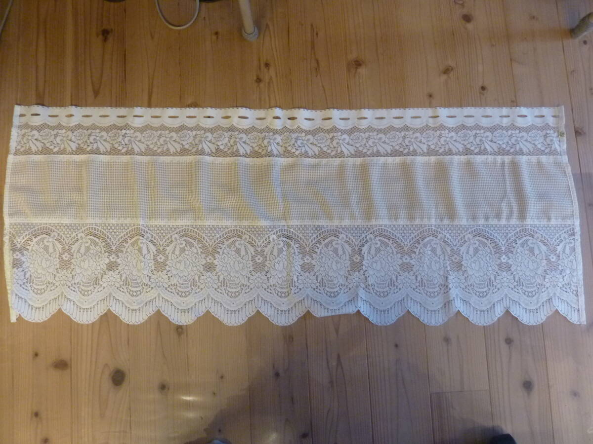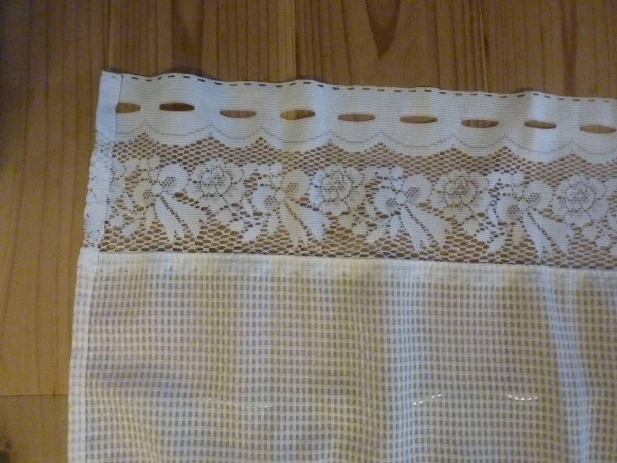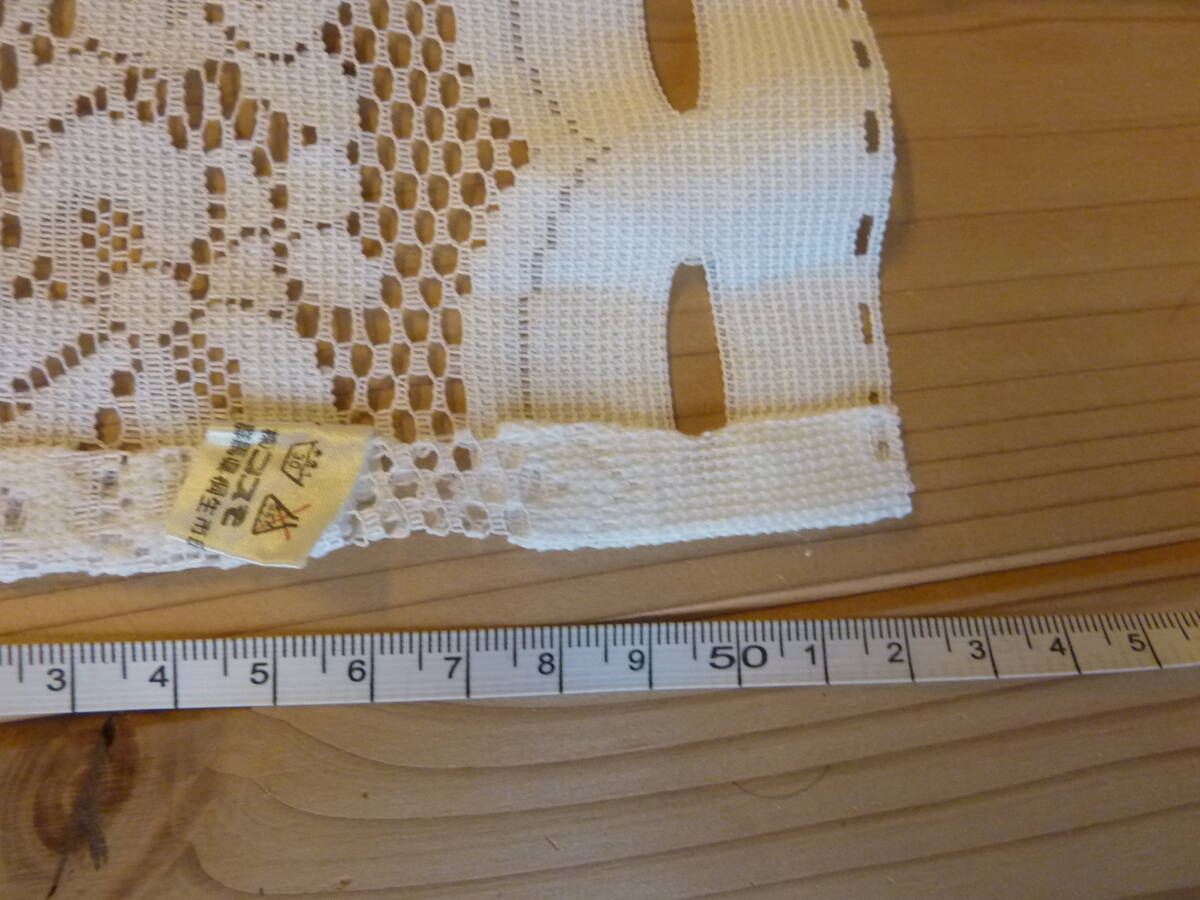 白色のレース装飾が施されたメッシュ生地のカフェカーテン、約140cm x 40cmのサイズ。 - 色: アイボリー - デザイン: レース装飾 - 素材: メッシュ生地 - サイズ: 約138cm x 52cm 中古品ですが、目立ったよどれはありません。 使ってくださる方、よろしくお願いします。