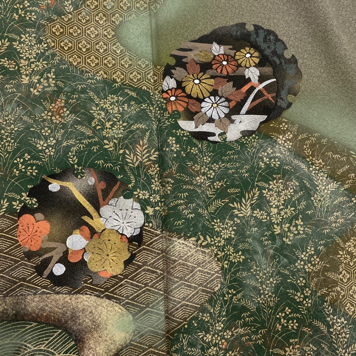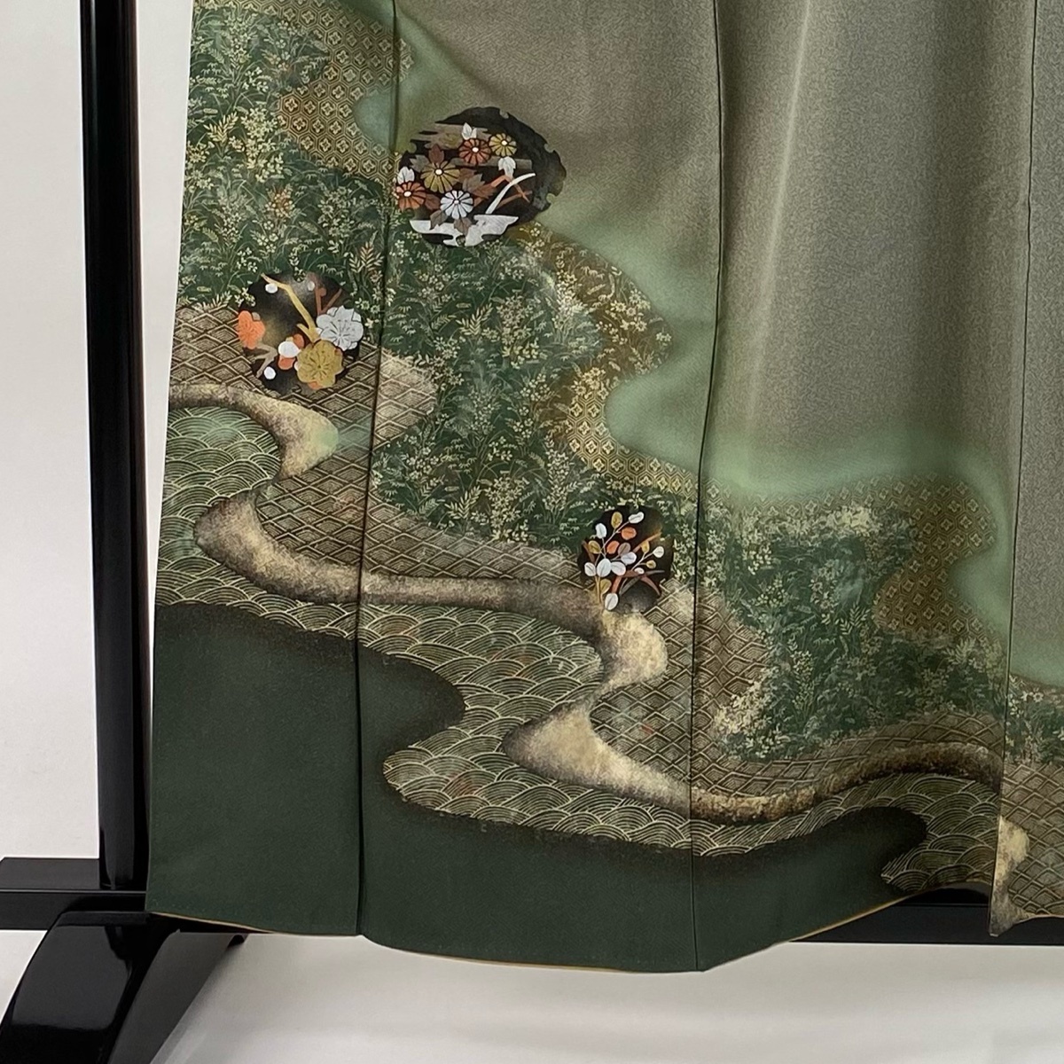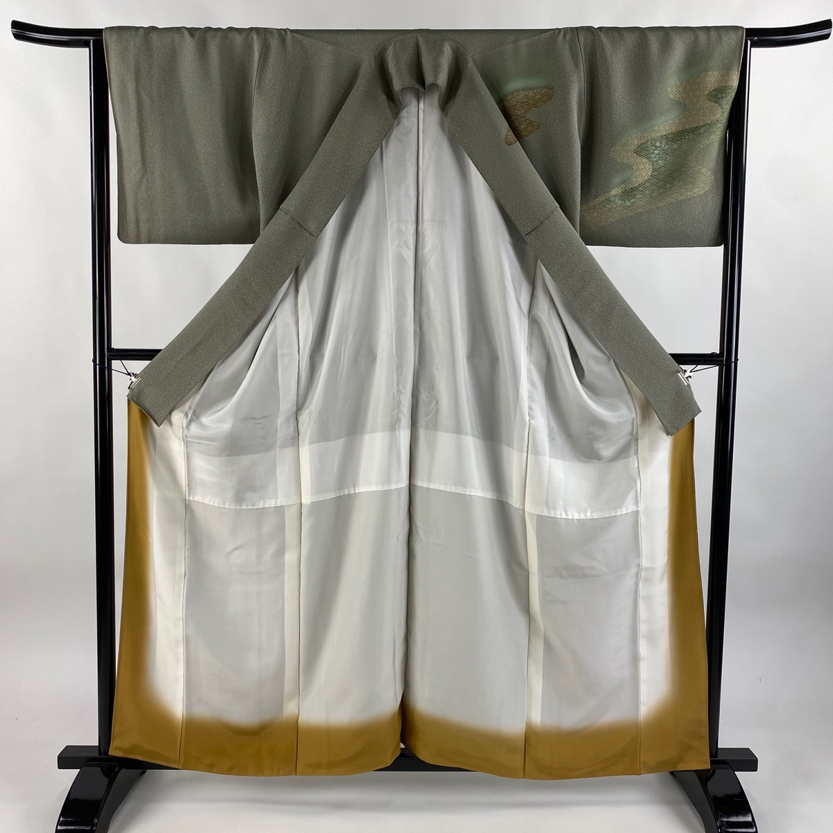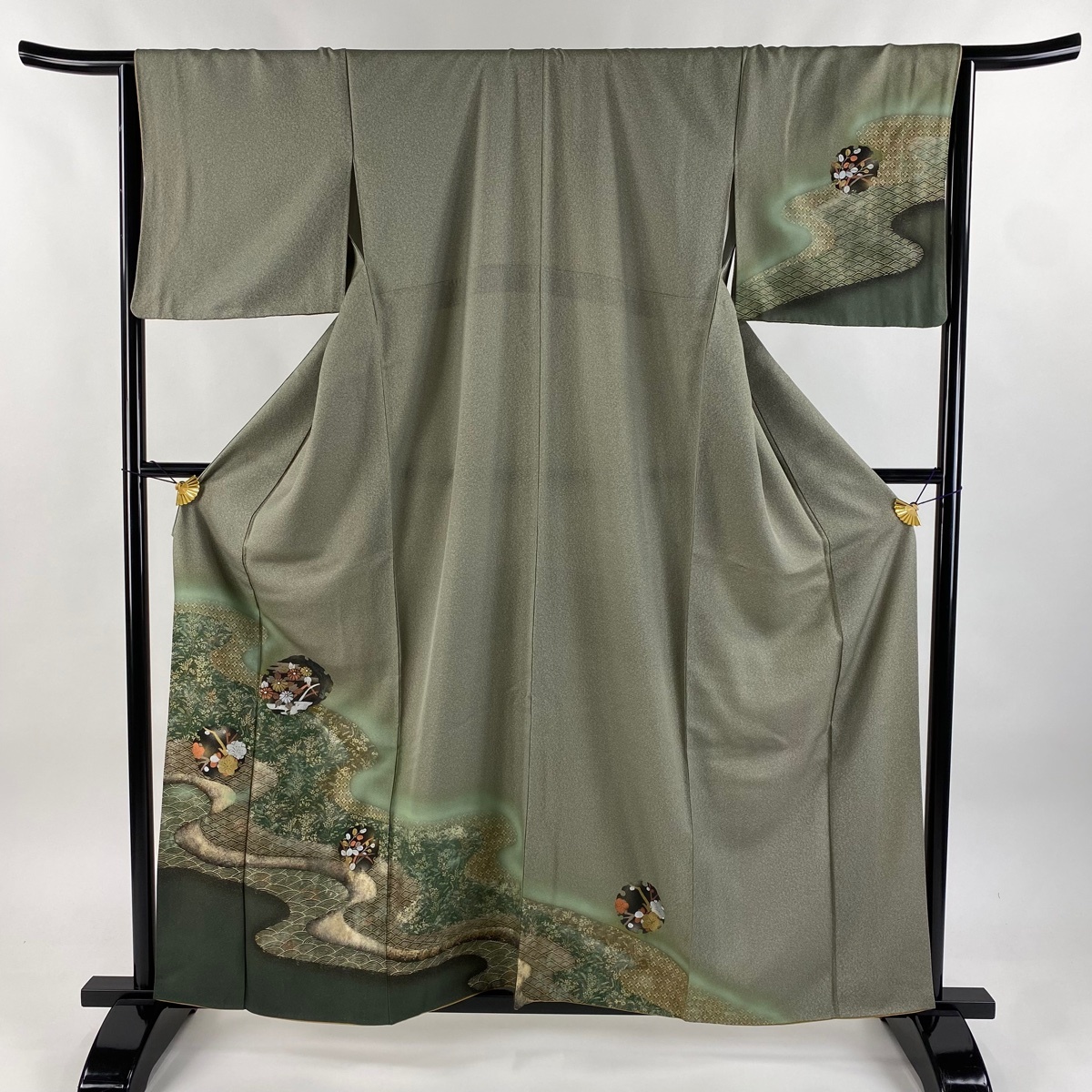 | 訪問着 美品 秀品 秋草 流水 金銀彩 ぼかし 灰緑 袷 身丈160 裄丈66 M 正絹 【中古】 |