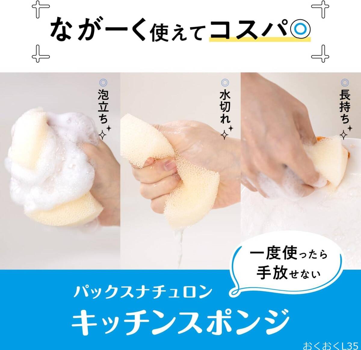 【泡立ち、水切れの良い台所用スポンジ】骨格構造の目の粗いキッチンスポンジ。泡立ち・水切れが良く衛生的で、研摩剤などを使用していないので食器を傷つけません。耐久性に優れているので長く使えて経済的です。