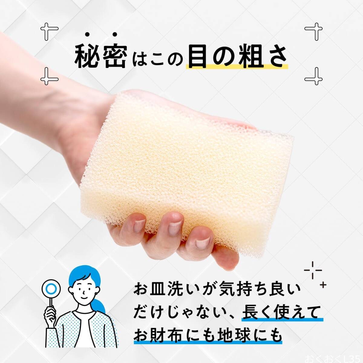 【一度使ったら手放せない】目の粗いスポンジなので少量の洗剤でも泡立ち抜群。研磨剤不使用なので食器を傷つけることなくお使いいただけます。また、使った後の水切れが良く、ヌルヌルしないので衛生的です。