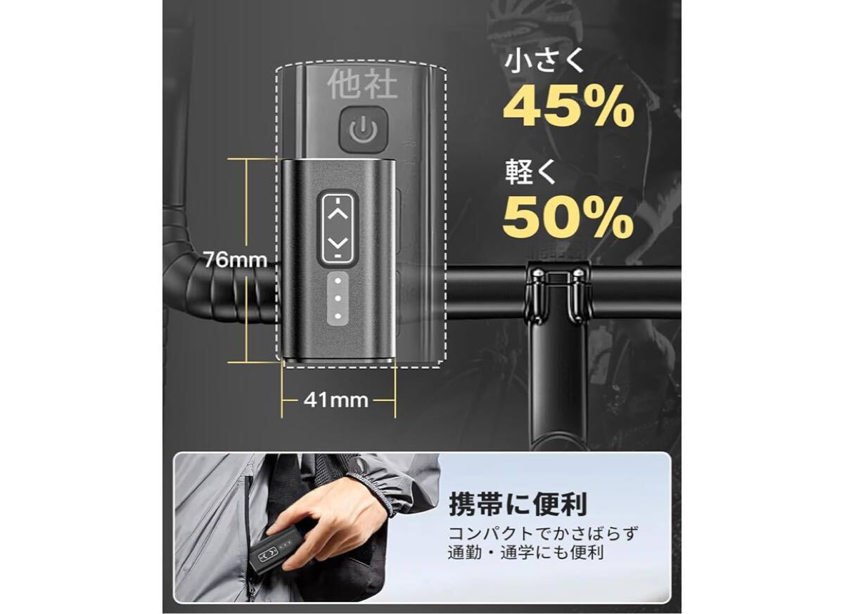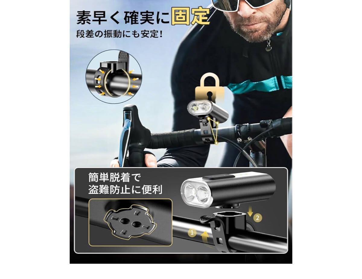 【コンパクトで軽量 簡単取り付け】本自転車ライトは約95gと軽量でコンパクト、持ち運びに便利です。取り付けは簡単で、ブラケットをハンドルに固定し、本体の溝に合わせて差し込み、約45度回転させて「カチッ」という音がしたらしっかり固定されます。通勤時には素早く取り外しが可能で、紛失防止にも役立ち安心してお使いいただけます。※本製品にはライト用ブラケットが付属しており、別途購入の必要はありません。
