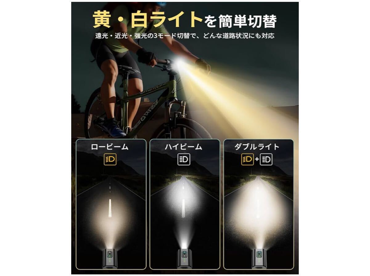 自転車 ライト【2025年業界初の黄白切替ライト】13段階調光 高輝度 自転車ヘッドライト 180°大ワイド照明 記憶機能搭載 USB-C充電式 ロードバイク/クロスバイク ライト アルミ合金設計 IPX5防水 防振 取り付け簡単 小型・超軽量 LEDヘッドライト 防災/地震/停電/登山/緊急対応 懐中電灯兼用 PSE認証済