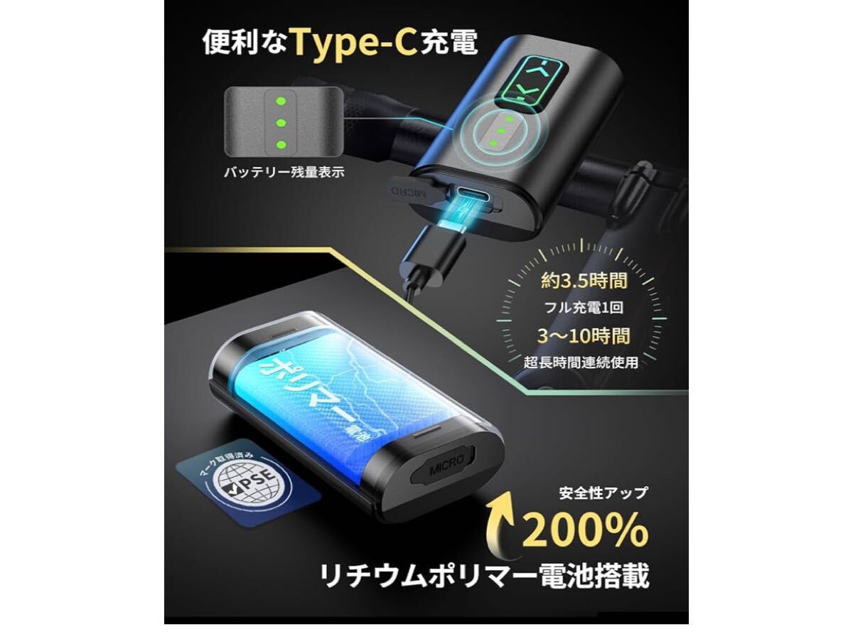 【リチウムポリマー電池搭載 & PSE認証済】自転車ライトには、スマートフォンと同等レベルのリチウムポリマー電池(2000mAh)を搭載。従来のリチウムイオン電池に比べて安全性・安定性に優れ、長時間の使用でも安心です。日本のPSE認証も取得済みで、安全基準を満たしています。さらに、便利なUSB-C充電に対応し、手軽かつスピーディーに充電可能。大容量により、長時間の連続使用や超長時間の待機にも対応します。