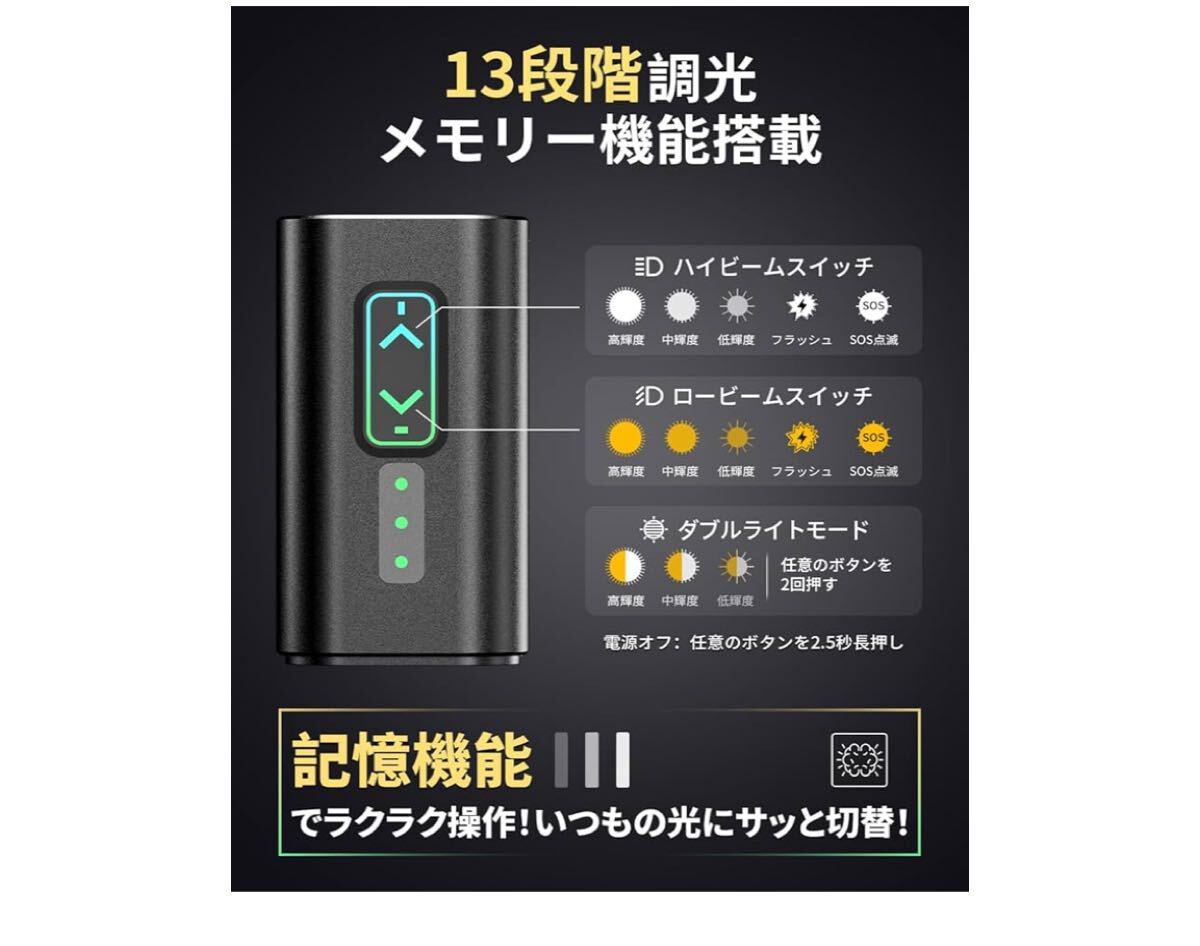 【近光・遠光切替&13種類点灯モード】この自転車ヘッドライトは、近光・遠光・全点灯の3モードを搭載し、簡単に操作できます。ハイビーム:上ボタンを短押しで、強・中・弱・点滅・SOSの5段階に切替。 ロービーム:下ボタンを短押しで、強・中・弱・点滅・SOSの5段階に切替。全点灯:どちらかのボタンを素早く2回押すと起動。強・中・弱の3段階に対応し、いずれのボタンでも切替可能です。メモリー機能(全点灯モードを除く)により、前回の設定で再点灯します。