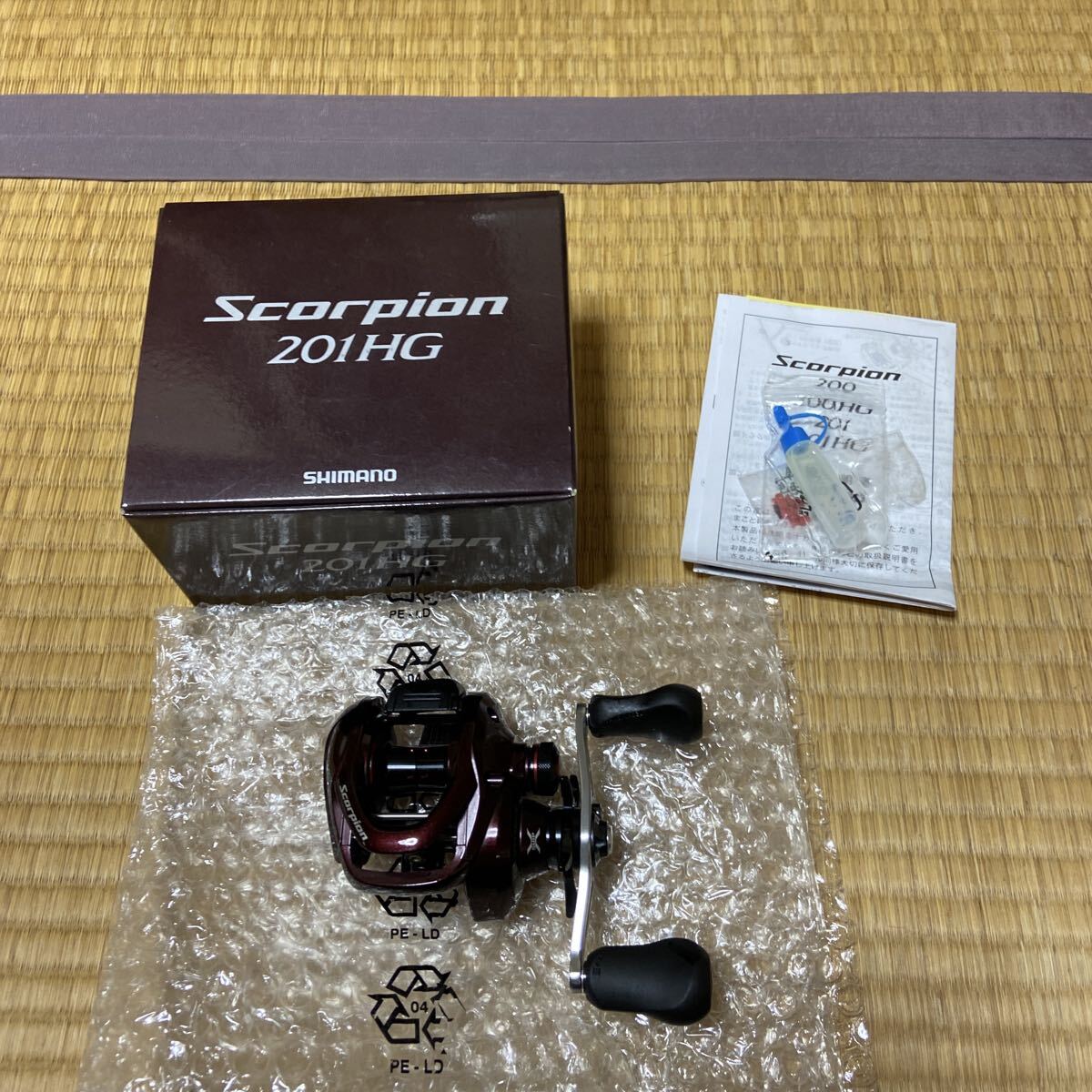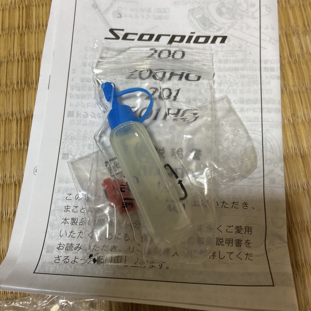 オイルか容器から漏れてました。少しリール側にも付いてしまっていますが、問題ないと思います。