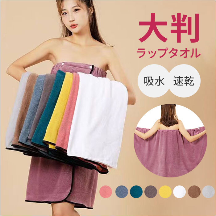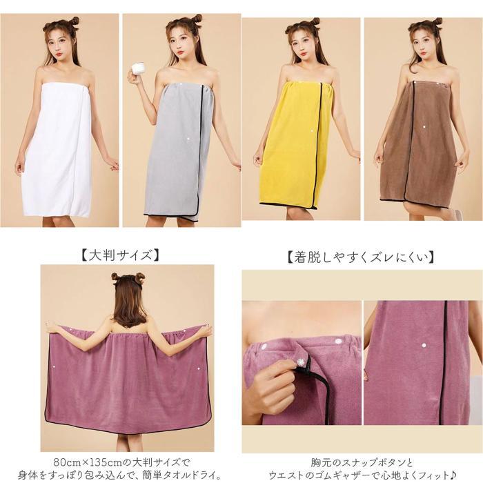 | 商品説明 | ・・【手軽に使えて便利】 ・お風呂上がりにパッと巻いて着用できるストレスフリーアイテム。 ・【大判サイズ】 ・80cm×135cmの大判サイズで身体をすっぽり包み込んで、簡単タオルドライ。 ・【着脱しやすくズレにくい】 ・胸元のスナップボタンとウエストのゴムギャザーで心地よくフィット♪ ・【うれしい吸水速乾】 ・柔らかく肌に優しい素材を使用。水気や汗を素早く吸収し乾きが早い◎ ・【使い勝手抜群】 ・かさばりにくい生地感でジムやプール、温泉などへの持ち運びにもおすすめ。 |