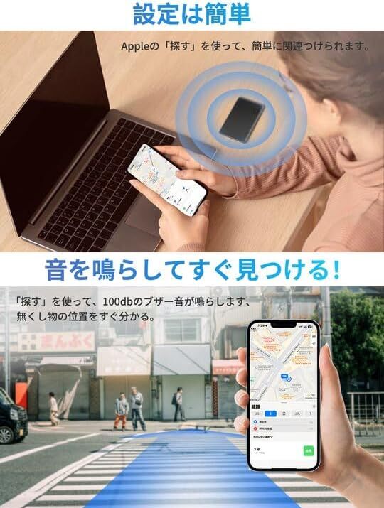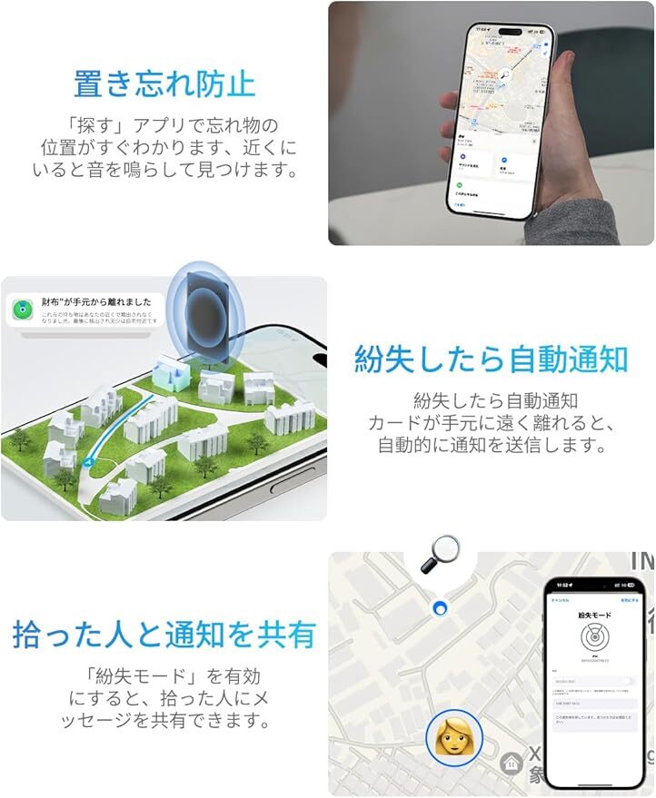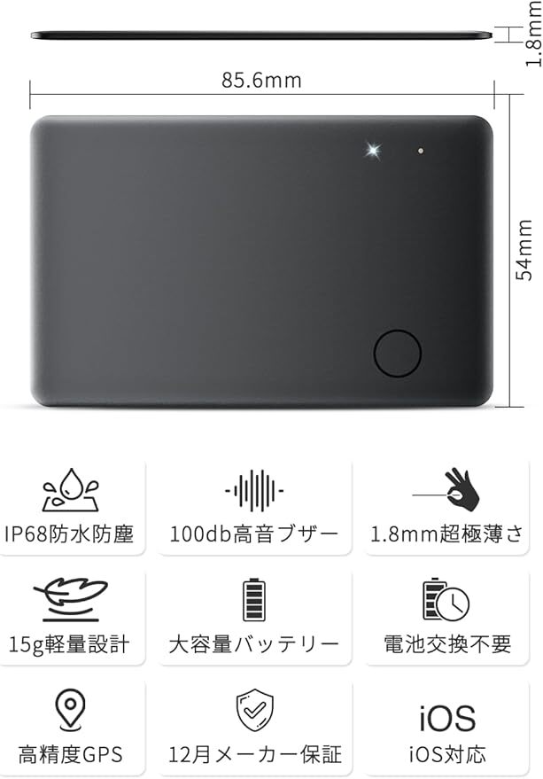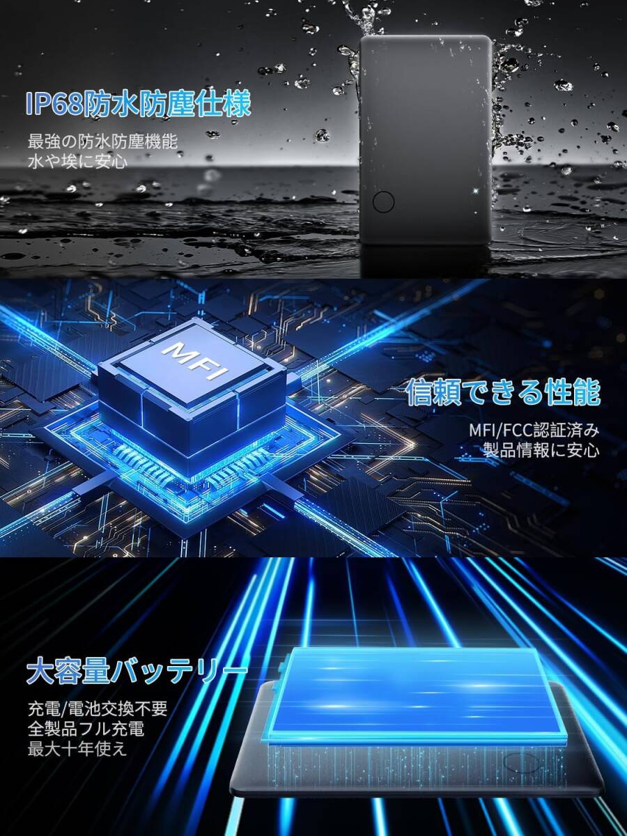 【超高性能 紛失防止タグ!】(1)充電不要!電池交換不要!全製品フル充電、10年使える!!(2)極薄のカードタグ!!普通のカードの厚さ、僅か1.8mm!!(3)IP68レベルの防水防塵性!水洗いOK!(4)100dB大音量ブザー搭載!(5)LEDランプ付き!正しく押されたかはっきり分かります!夜中でも見つかりやすい!(6)MFi&Telec認証済み!Apple「探す」に対応!(7)丈夫で折れにくい仕様!【10年使える!】長持ちバッテリーと省電力技術を採用。使い捨てタイプの中でもっとも長持ち。電池交換・充電の手間がかかりません。お財布、貴重品の忘れ物防止、犬や猫の追跡、子供、高齢者のお見守り、車やバイクの位置確認や盗難防止など、様々なシーンに役立ちます。バッテリーの消耗は使用環境、音を鳴らす頻度などによって異なる場合があります。