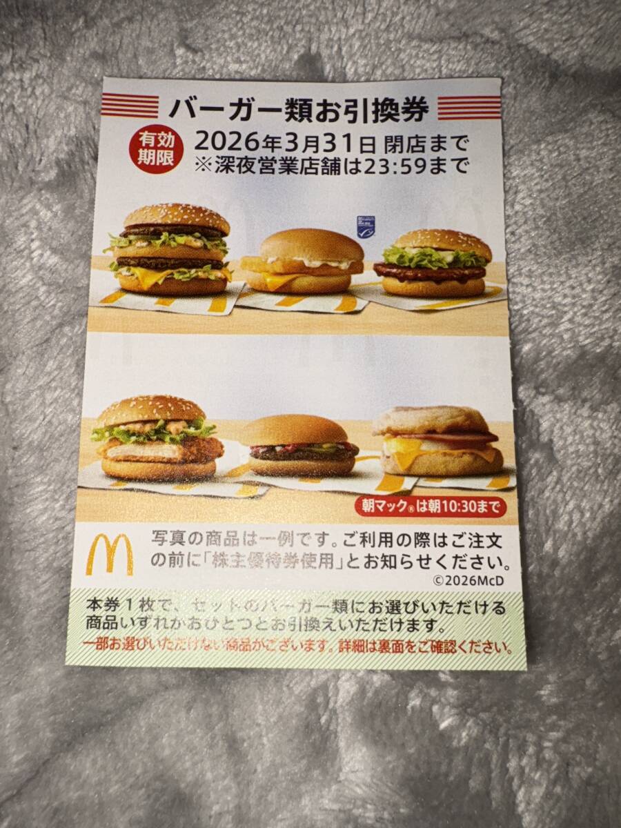 こちらは、マクドナルド株主優待バーガー類引換券期限来年3月31日まで