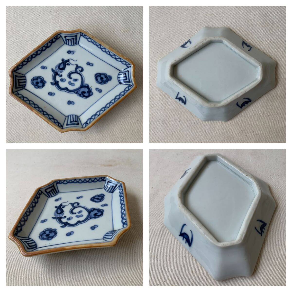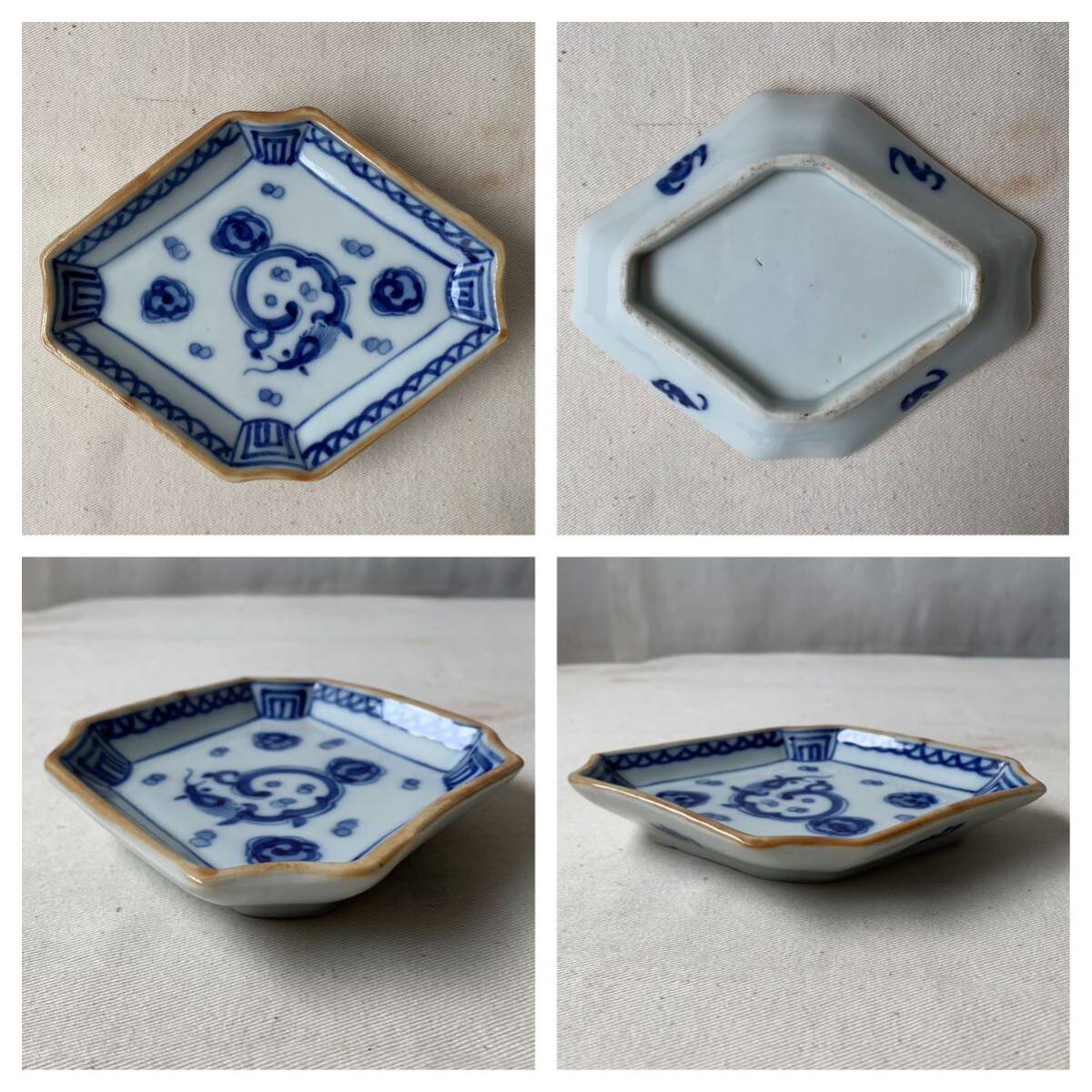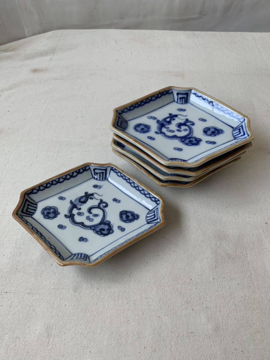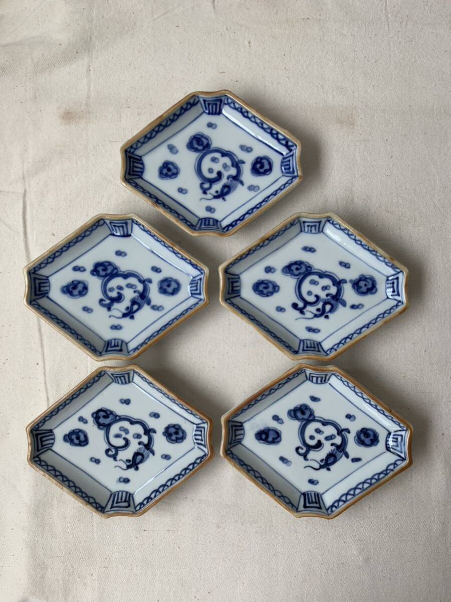 旧家蔵出し品 デザインが素敵な菱形染付皿五枚セットです。コレクションの一品にいかがでしょう。
