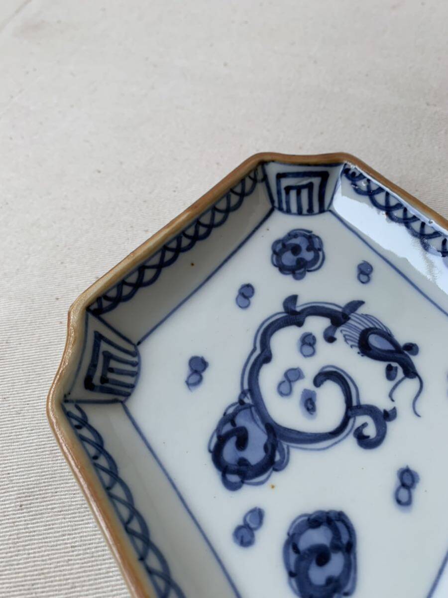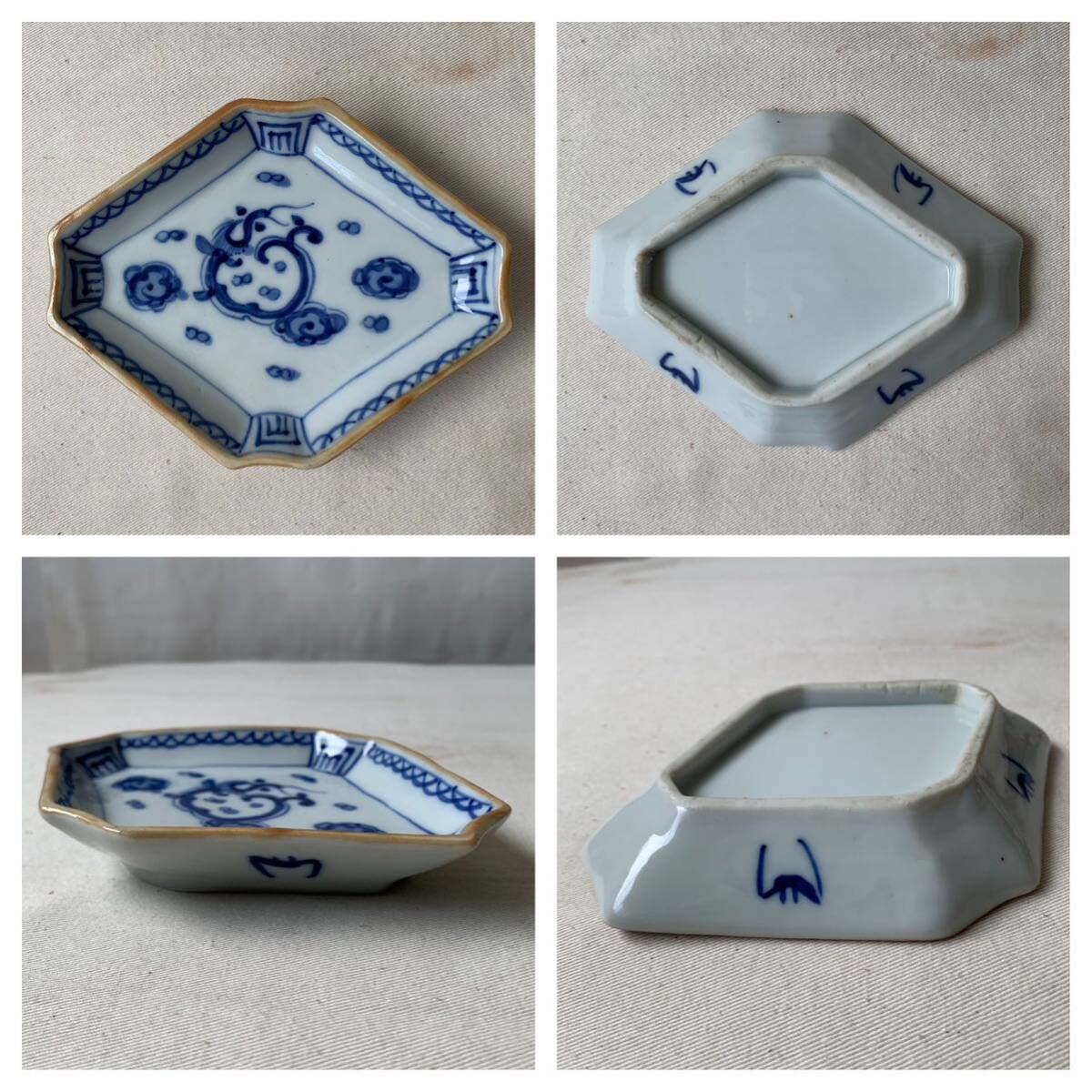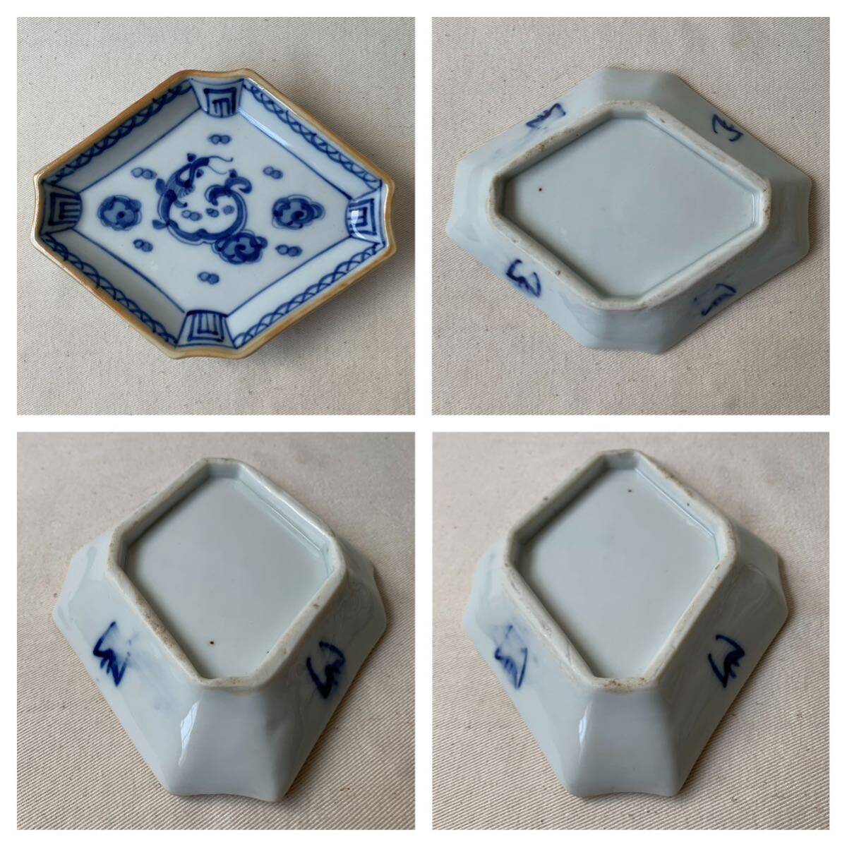 旧家蔵出し品 デザインが素敵な菱形染付皿五枚セットです。コレクションの一品にいかがでしょう。