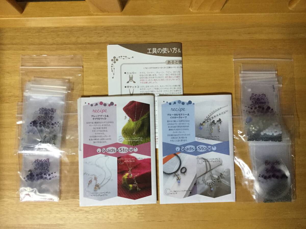 ●アイテム:マンスリークラブ ビーズアクセサリー作成キット 天然石を使用した「ビーズ&ストーン」 2種(グレーアゲート&ラブラドライト と ブルーカルセドニー&イエロークォーツ)  パーツ/レシピ/工具の使い方シートは1枚のみ/外箱なし
