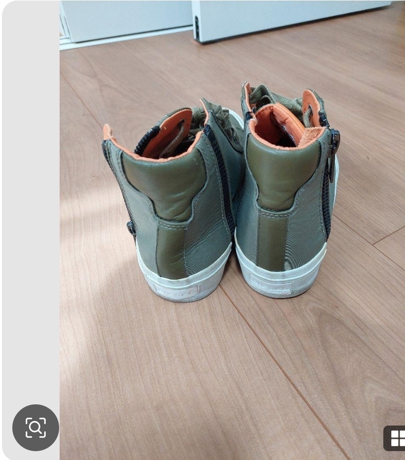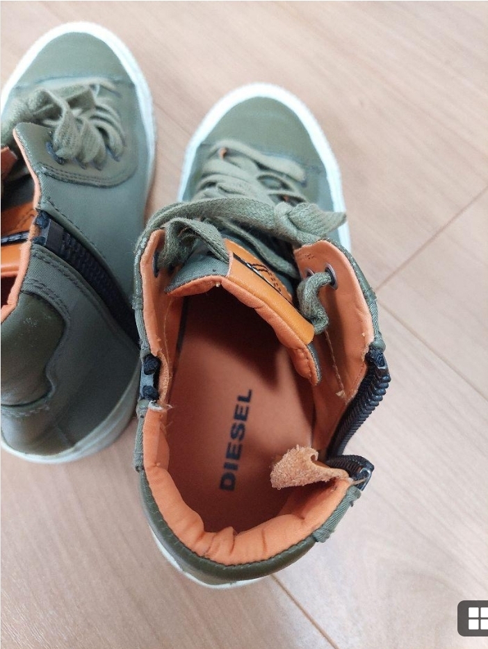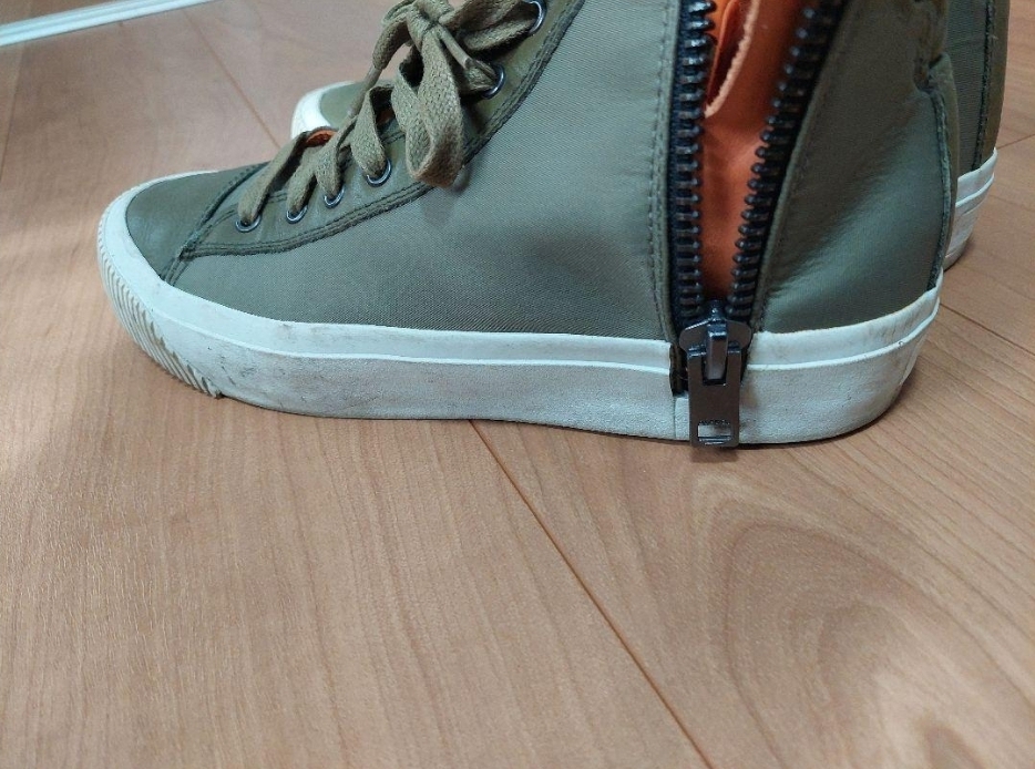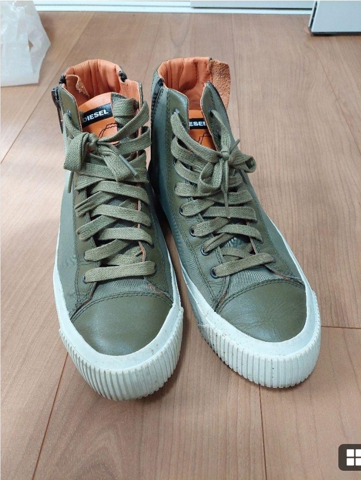 オリーブ色のDIESELハイカットスニーカー、サイドジッパー付きでスタイリッシュ。