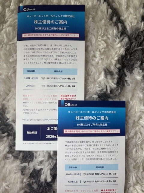 コード通知!最安1円~★【QBハウス】株主優待 無料ヘアカット券2枚★QB HOUSE キュービーネットホールディングス(2026年6月30日まで)