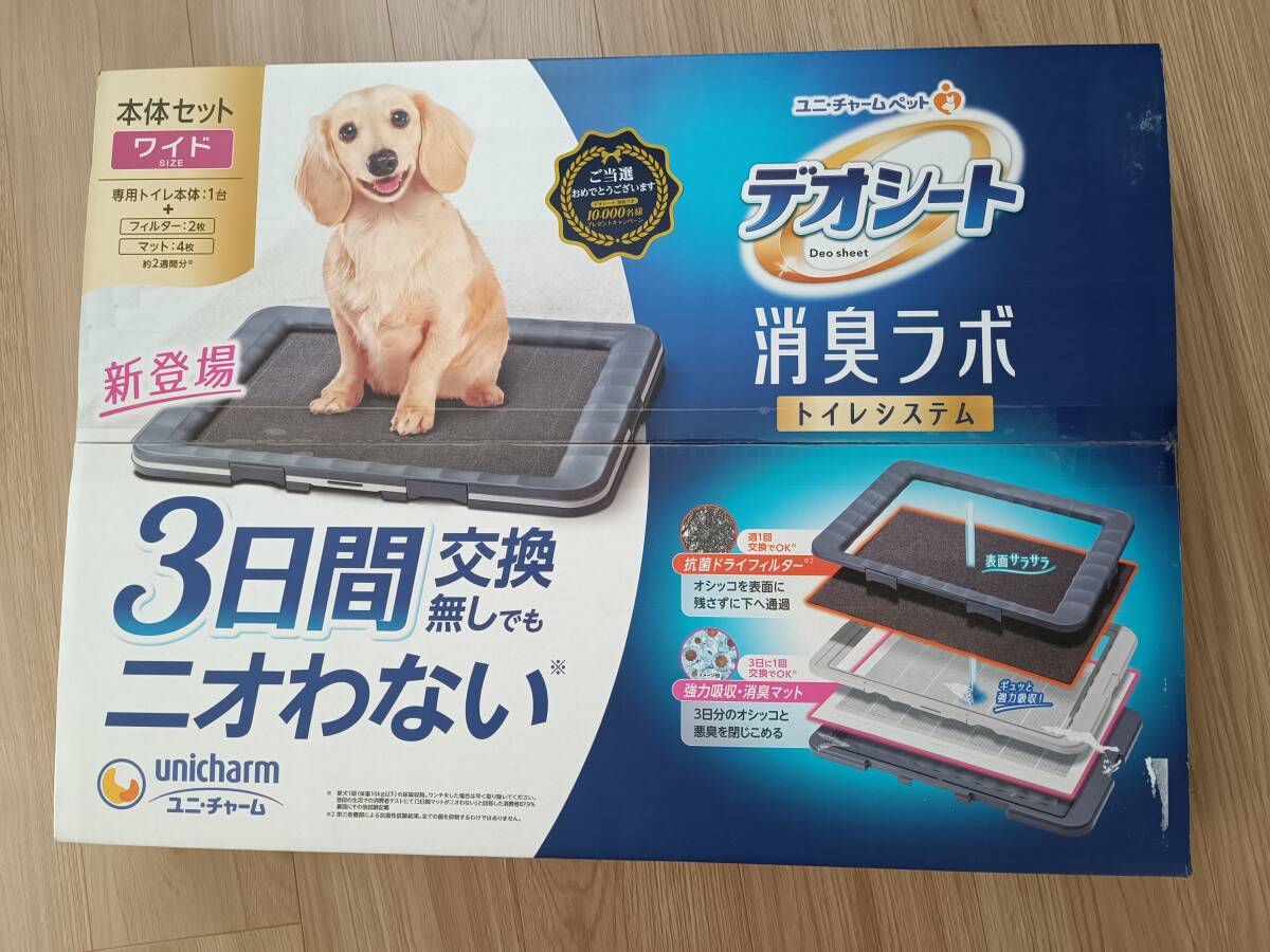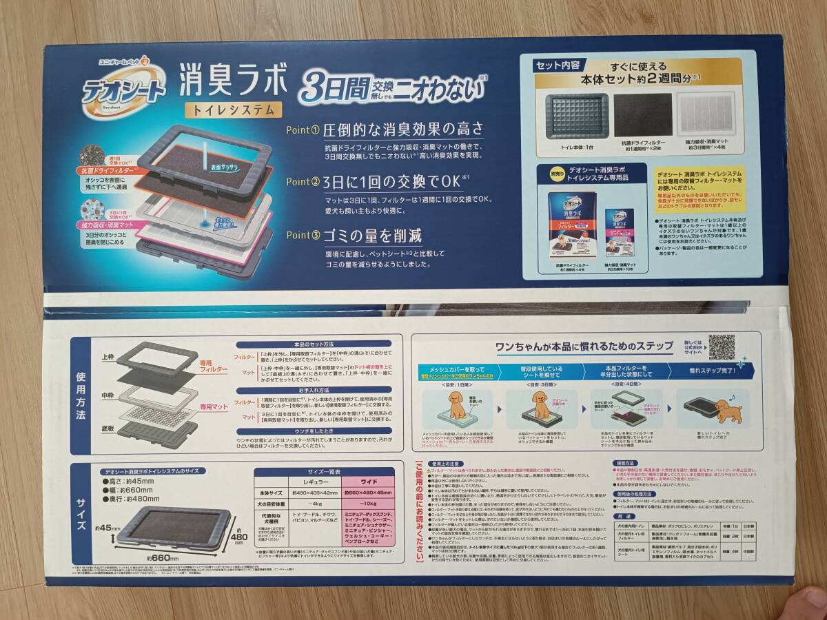 • ・抗菌ドライフィルターと強力吸収・消臭マットの2層構造で3日間交換無しでもニオわない犬用トイレシステムです。マットは3日に1回、フィルターは1週間に1回の交換でOK※。 ※1 愛犬1頭(レギュラー:体重4kg、ワイド:10kg以下)の尿吸収時。ウンチをした場合は早く取り除いてください。普段の生活での消費者テストにて「3日間マットがニオわない」と回答した消費者87.9%。閉鎖空間にて1日1回20ccの犬尿を滴下した後での3日後の臭気判定士による臭気強度・快・不快度評価の実施、また、20ccの犬尿を滴下した後の3日後のアンモニア濃度評価を実施、ユニ・チャーム調べ。※2 第三者機関による抗菌性試験結果。すべての菌を抑制するわけではありません。