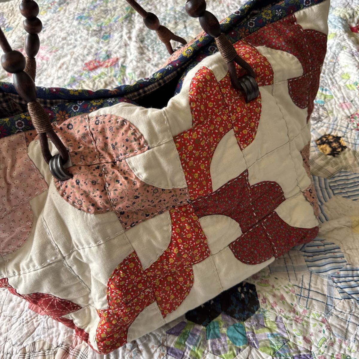 パッチワークデザインのキルティングトートバッグ、赤とピンクの配色が魅力。