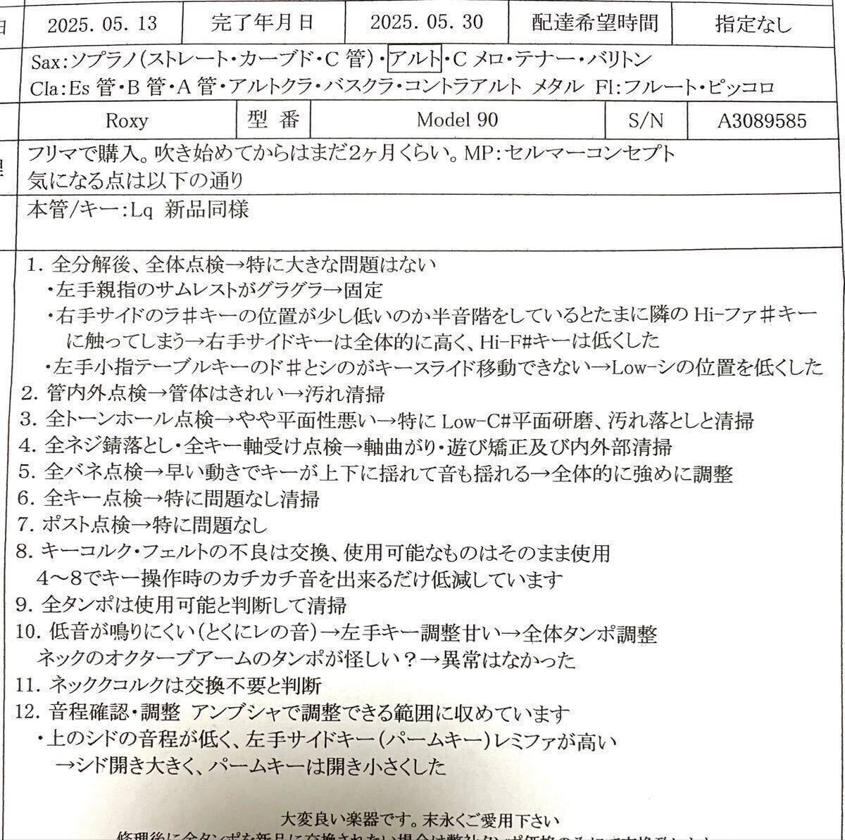 今年5月にサックスを専門にリペアされてる業者さんに全分解洗浄オーバーホールを依頼し現在に至ります。(調整の詳細は写真の最後にリペア証明書を載せています)