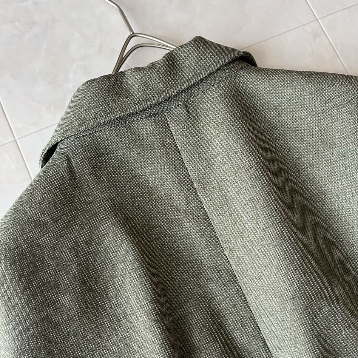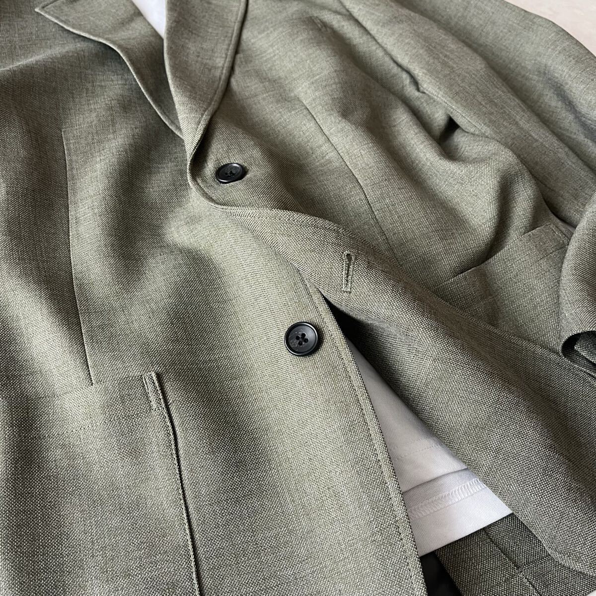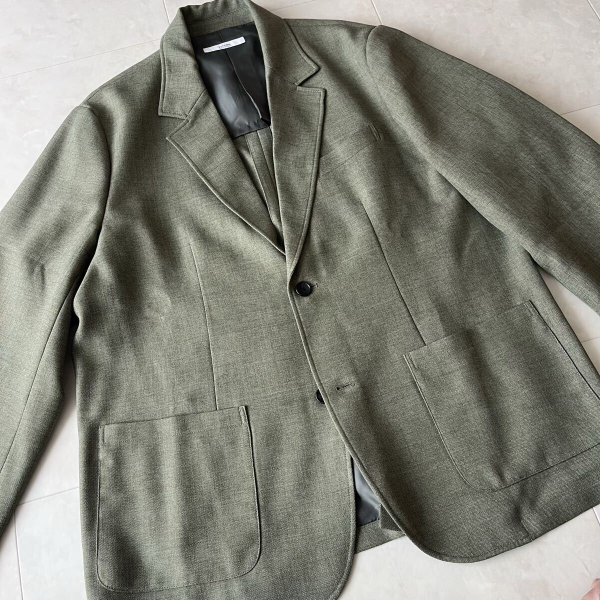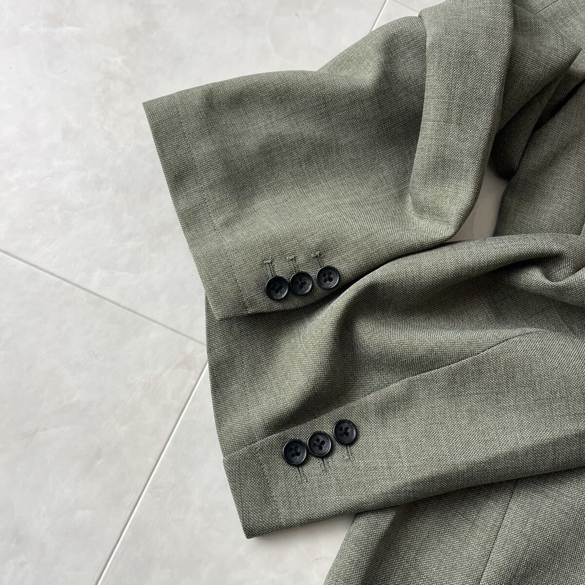 春〜初夏にぴったりな麻調の風合いと落ち着いたカーキグリーン色。2つボタン仕様で、カジュアルからキレイめまで使える一着です。極美品ランクなので、状態にこだわる方にもおすすめ。