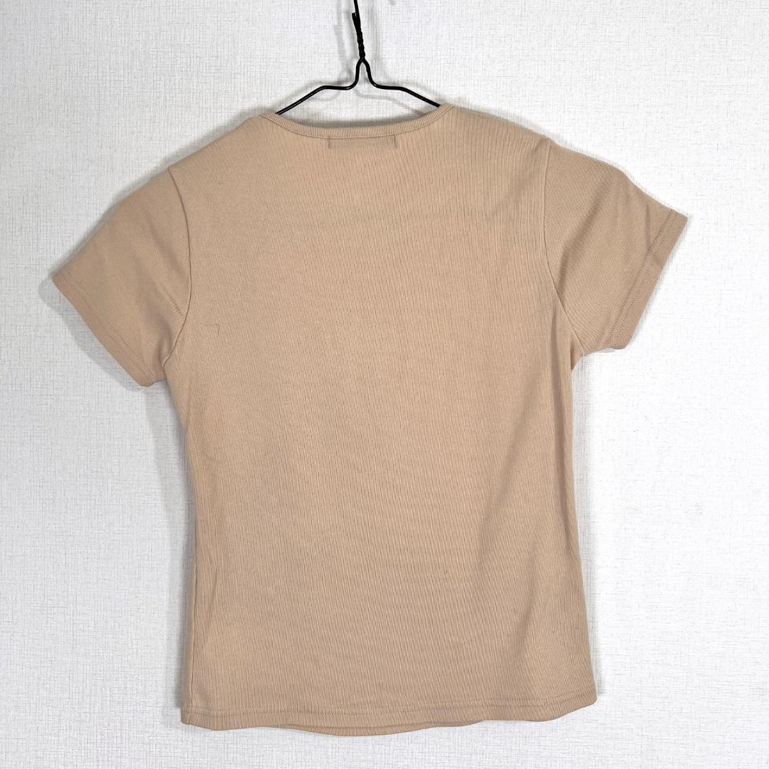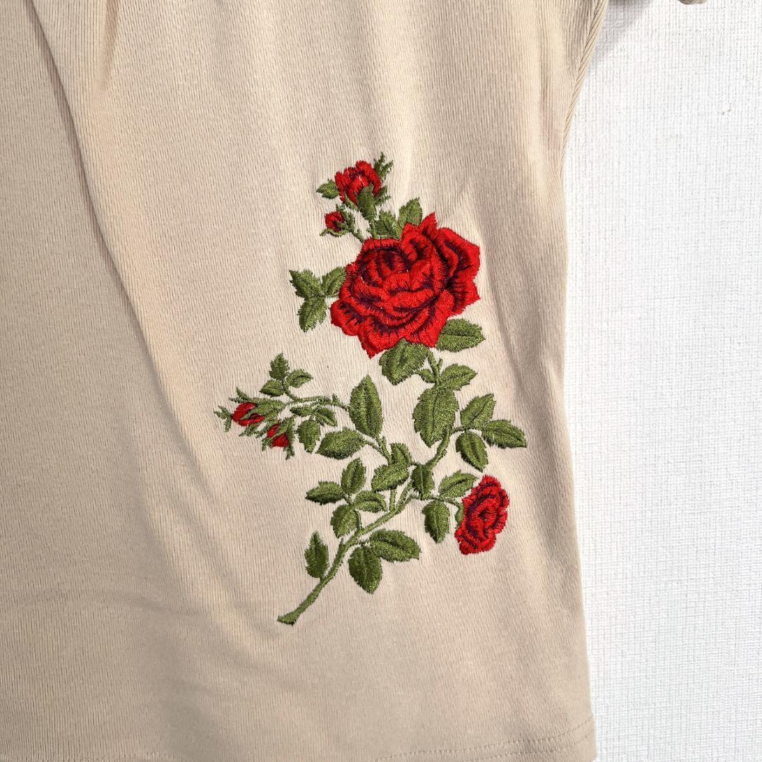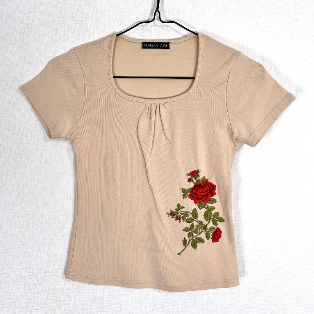 【昭和レトロ】バラ刺繍 薔薇 ベージュ 半袖 綿ニット カットソー Tシャツ トップス 女性用 韓国製 レディース Lサイズ【c016】