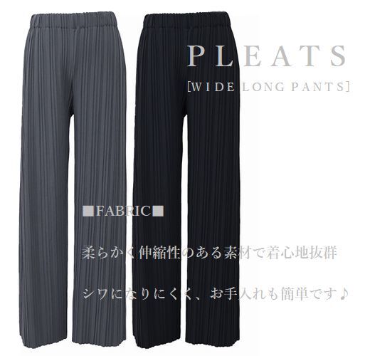 通年使える美しいシルエットが自慢のプリーツ加工ワイドロングパンツ。伸びの良いゆったりウエストゴムで長時間ノンストレスな着心地。通勤オフィス対応◎デイリーにお出かけに大活用いただけます。