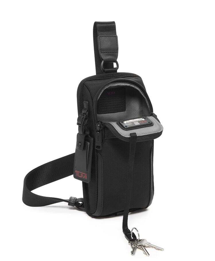 TUMIの代表的な素材、FXTバリスティックナイロンを使った、デイリーユースに最適なコンパクトスリング。背面にスリップポケットを備え、携帯や交通系電子カードなどの出し入れに便利。メインの収納部は、お財布などちょっとした小物を持ち運ぶのに最適なサイズです。