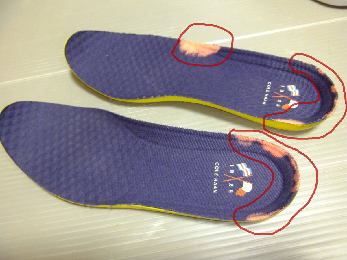 ◆インナーソールは、洗浄の際に、ブリーチで一部が色落ち変色しています。