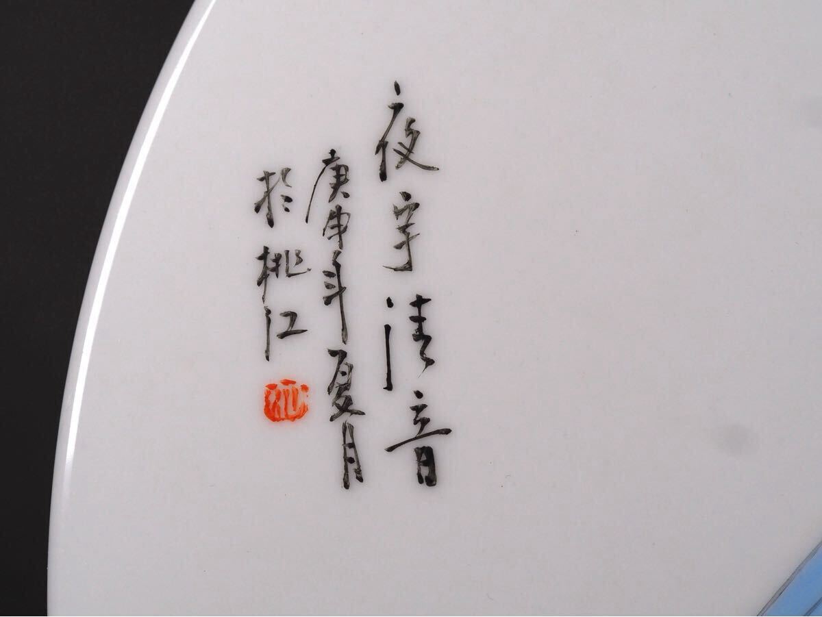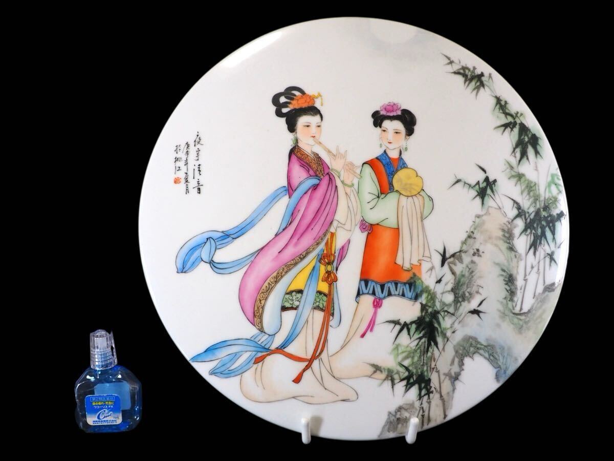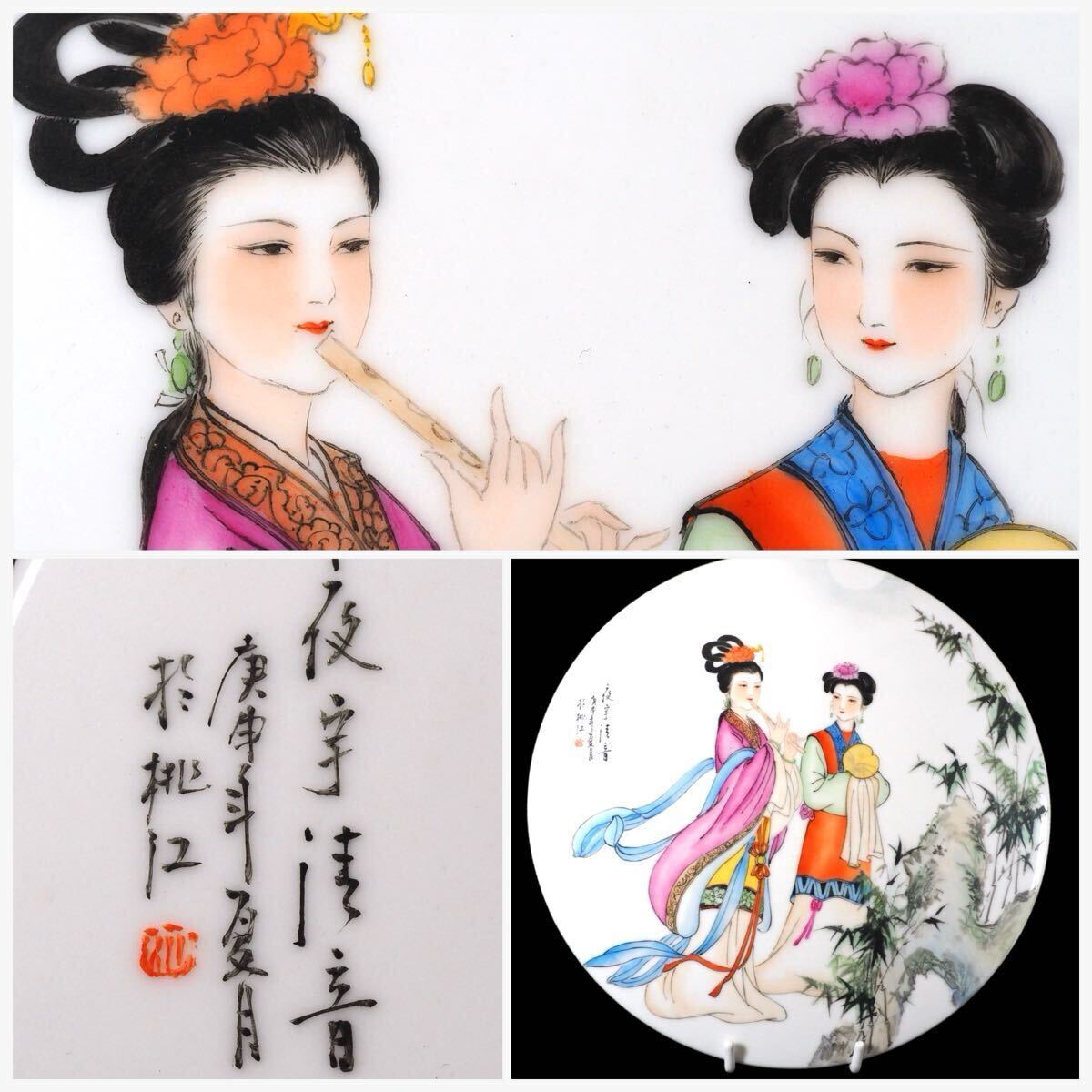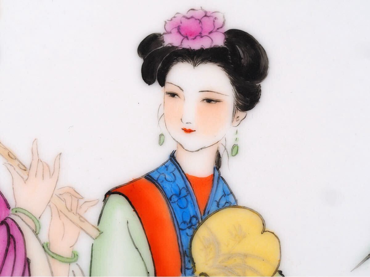 中国 時代磁板(陶板) 在銘 超絶粉彩細密画 宮廷美人図 漢文詩 作家銘 景徳鎮 唐物文房四宝 本物保証 見事な色彩