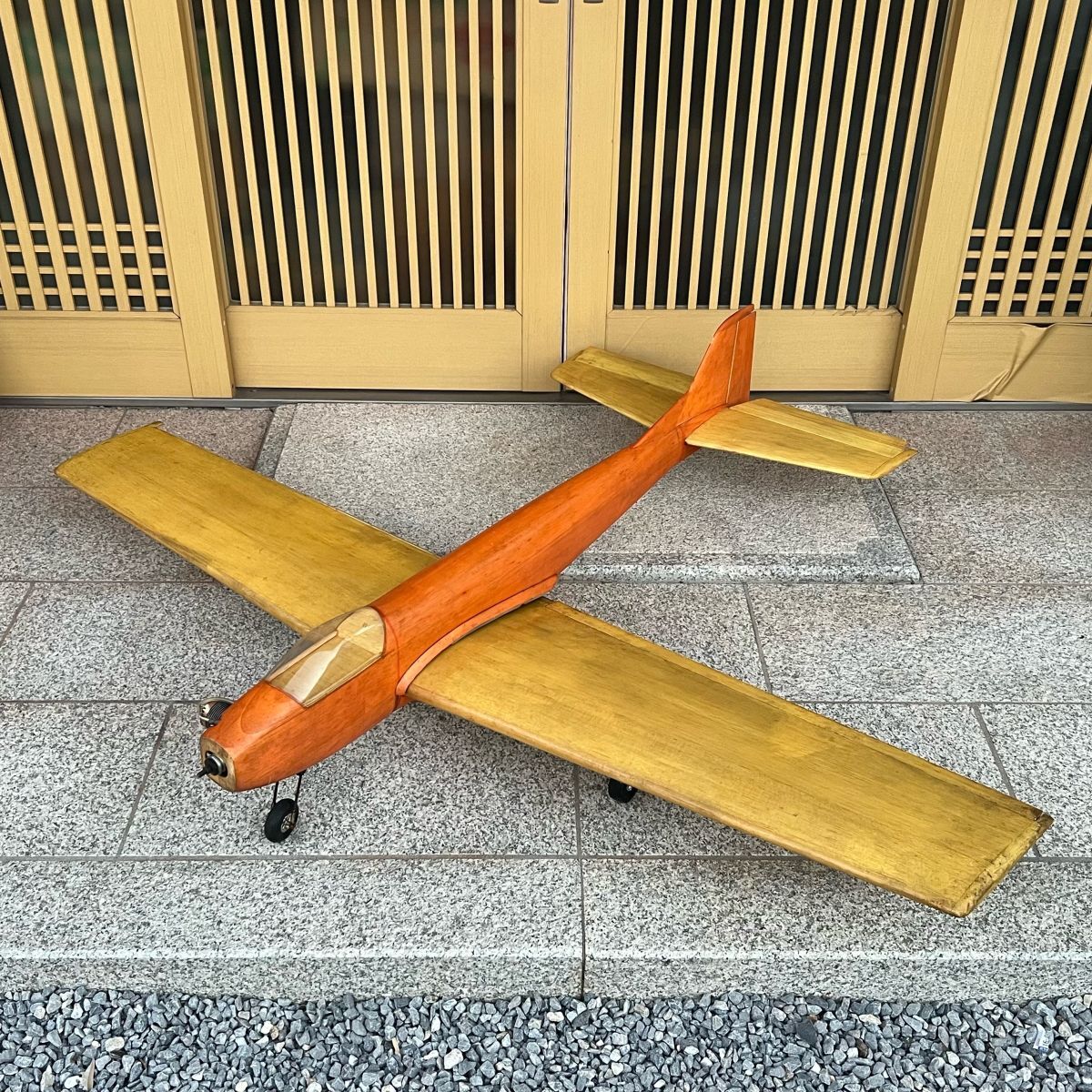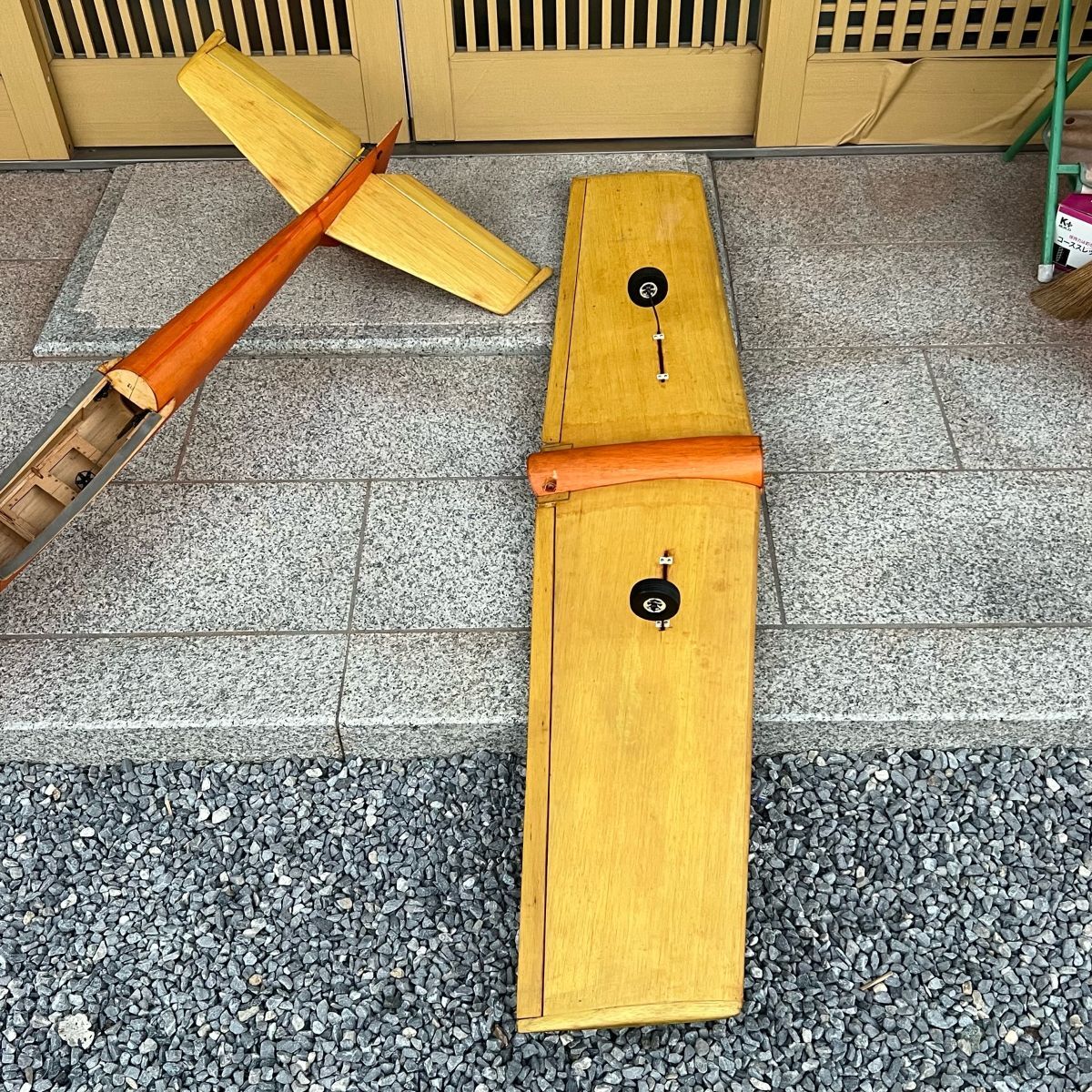 ご覧いただきありがとうございます。 こちらは O.S. MAX 45エンジン搭載の木製ラジコン飛行機(全長165cm/翼幅135cm) です。 昭和期に製作されたトレーナー(練習機)タイプのクラシックRC機で、 丁寧な木工仕上げとニス塗装が美しい一機です。 【商品詳細】 全長:約165cm 翼幅:約135cm 材質:バルサ+合板構造(木目仕上げニス塗装) エンジン:O.S. MAX 45(2サイクルグロー) キャノピー:クリアタイプ(経年による黄変あり) 主翼:一体型(胴体差込式) 脚部:前輪+主脚あり(スプリング構造) 重量:約2.5〜3kg前後(推定) 内部構造:サーボマウント・リンケージロッド残存 【状態】 ・長期保管品のため、経年のニスむら・小キズ・黄ばみ等あり。 ・エンジン(O.S. MAX 45)は固着なし、回転未確認。 ・キャノピーは歪み・曇りあり。 ・サーボ等の電子機器は付属していません。 ・木部の割れ・補修跡はなく、構造的にしっかりしています。 【特徴】 昭和期の職人製作によるバルサ構造機。 60クラスに近い大型サイズで存在感抜群。 木の温もりが感じられるナチュラルフィニッシュ。 コレクションやインテリア展示にも最適なコンディション。 当時のモデラー文化を感じさせる、味わい深い手作りRC機です。 構造・塗装ともに丁寧な仕上がりで、クラシックRC展示機としても非常に見栄えします。 写真のものがすべてとなります。 詳しい状態については写真を確認してください。 写真追加希望の方は質問より気軽におしゃってください。 |