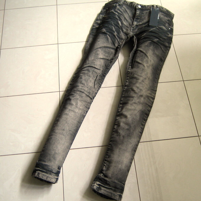 ■激しいピン打ちとケミカル加工に、濃淡差のあるカラートッピングを入れて独特の色合いに仕上げたスキニーデニム
