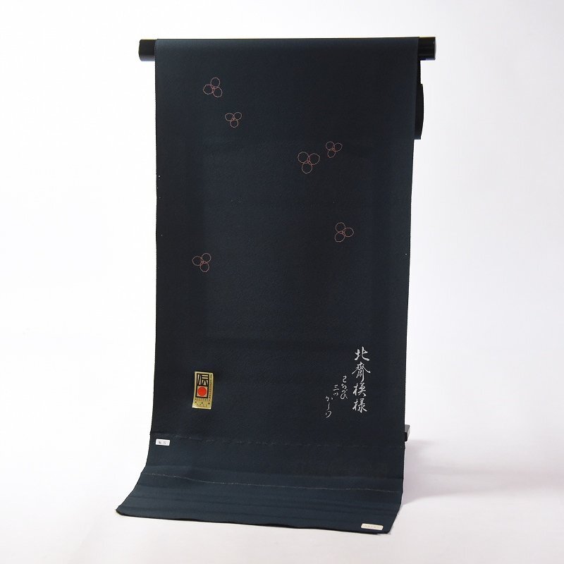 こちらは、葛飾北斎の「輪違い三つ柏」を、シンプルかつ上品に染め上げた京友禅の小紋着物(反物)です。
